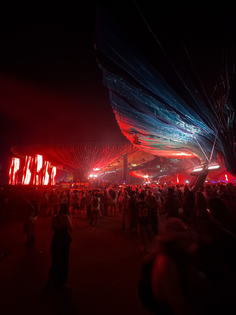 The image depicts a large crowd of people attending an outdoor music festival at night, likely the Coachella Valley Music and Arts Festival held in Indio, California, United States. The crowd is dense…read more