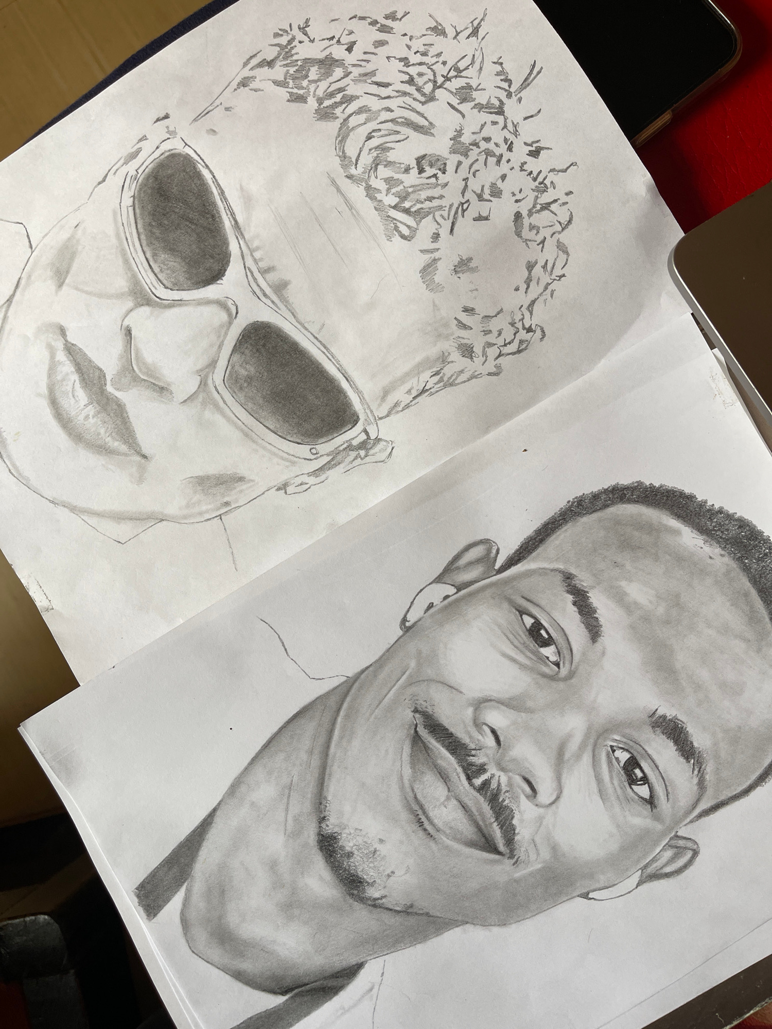 A two-page drawing in an open sketchbook lies on a table. The page on the left contains a pencil sketch of a person wearing sunglasses. The page on the right features a more detailed pencil portrait o…read more