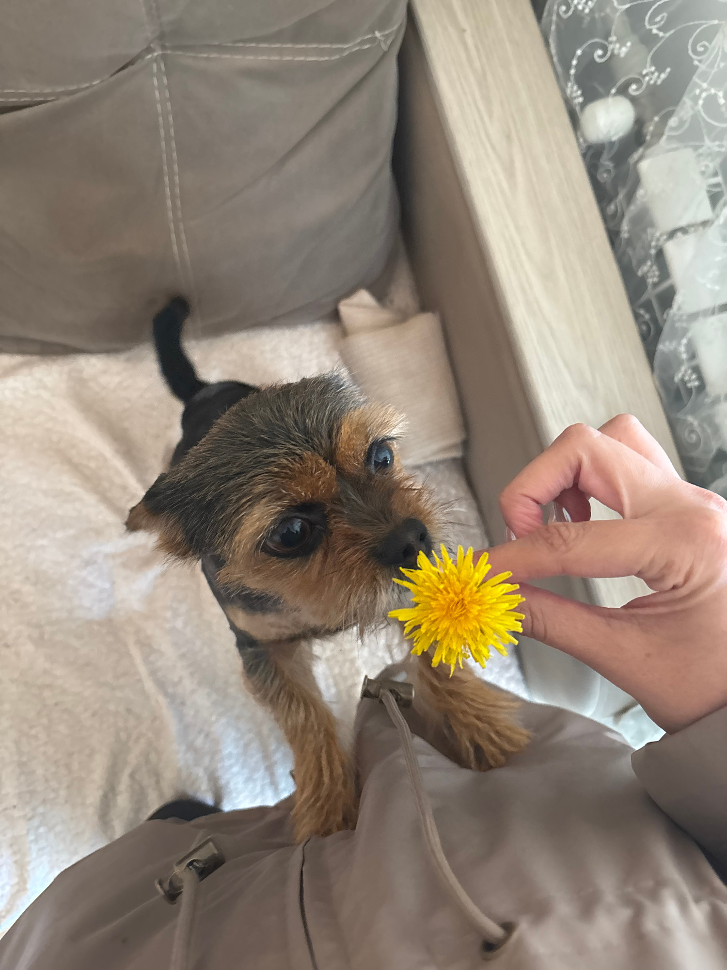 A close-up, high-angle shot shows a small terrier dog standing on a white textured surface and looking up at a yellow dandelion flower held by a fair-skinned human hand. The dog has a black nose, dark…read more
