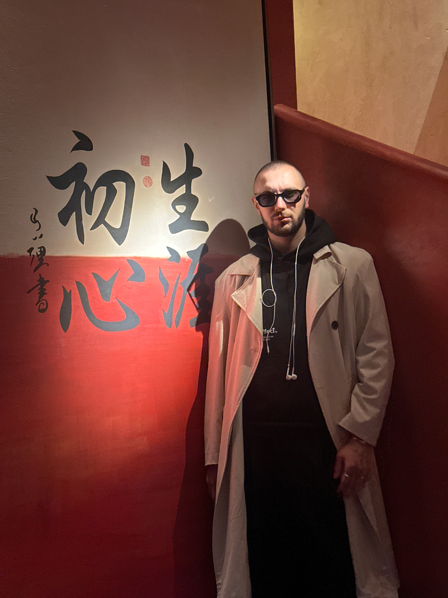 The image shows a bald man with sunglasses, a black hoodie, and a light trench coat, lying on a red bench in front of a wall. The wall is divided vertically, with the left side being white and the rig…read more