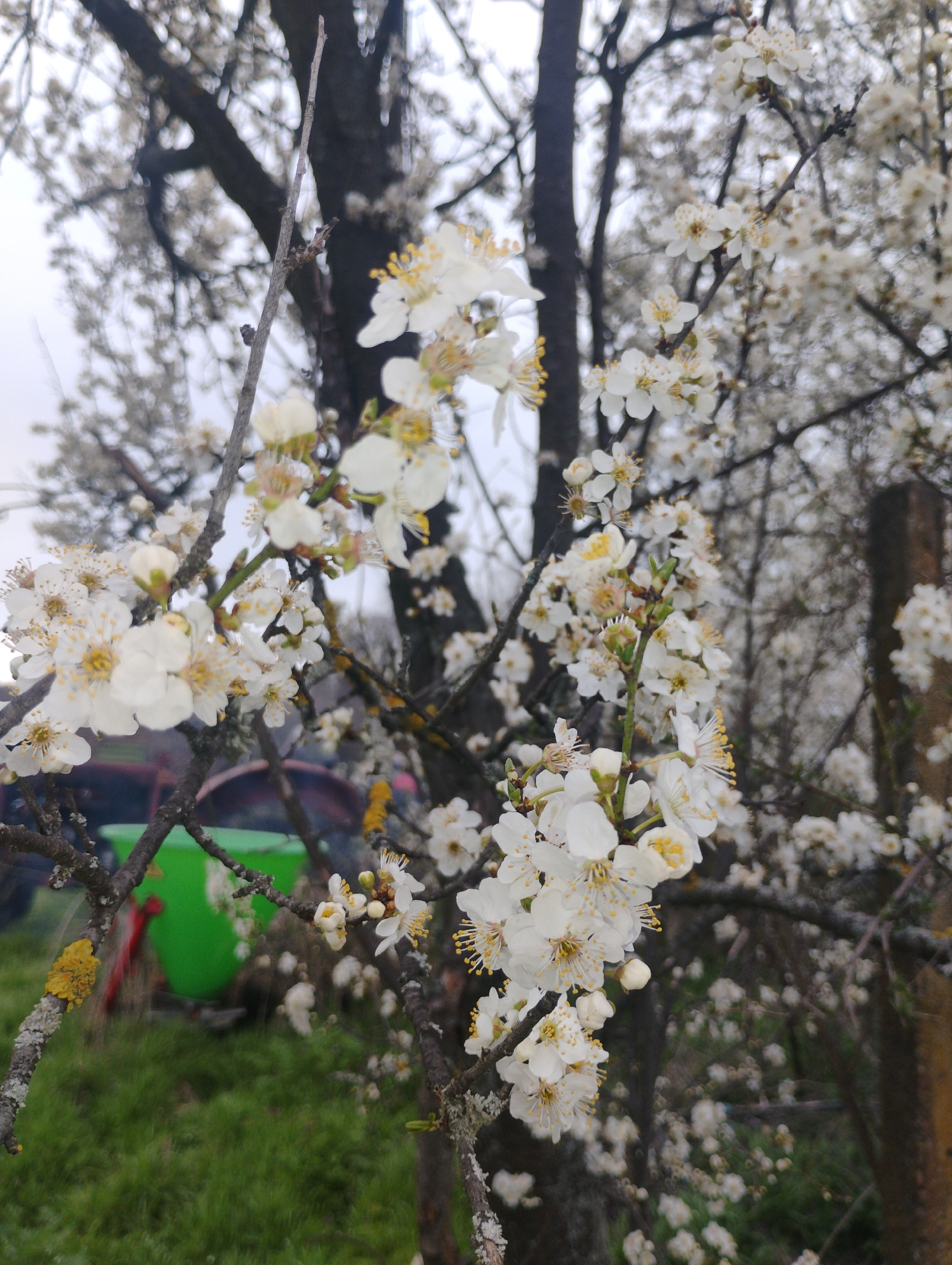 The image shows a close-up of a flowering tree branch with small white blossoms and yellow stamens. The background is blurred, but green grass and other tree branches can be distinguished. The locatioβ¦read more