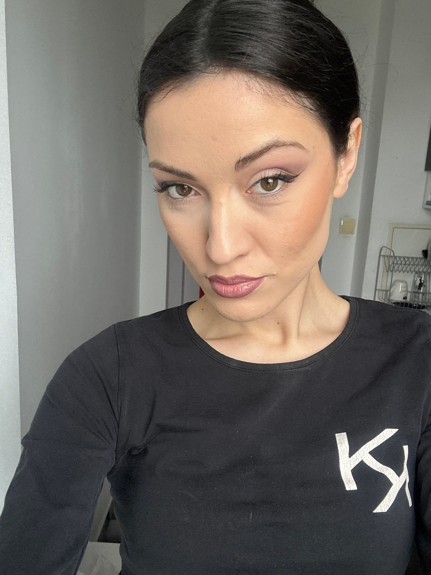A woman with fair skin and dark hair pulled back is wearing a black long-sleeved shirt with a white logo on the upper right chest. She is looking directly at the camera. The background appears to be a…read more