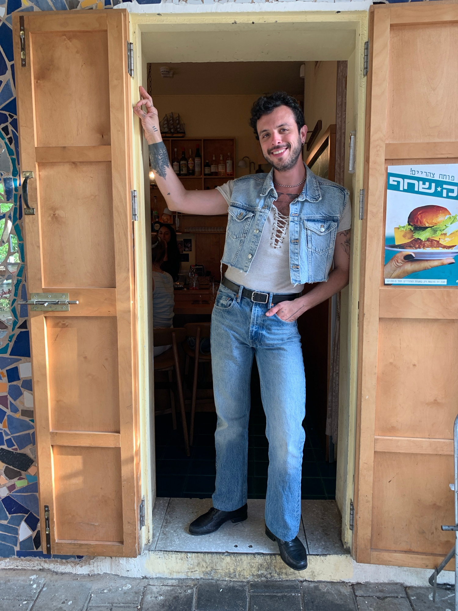 A man dressed in denim clothing stands in a doorway in Tel-Aviv, Israel. The man wears a denim vest over a light-colored shirt and denim jeans, cinched with a black belt, and black shoes. He has dark…read more