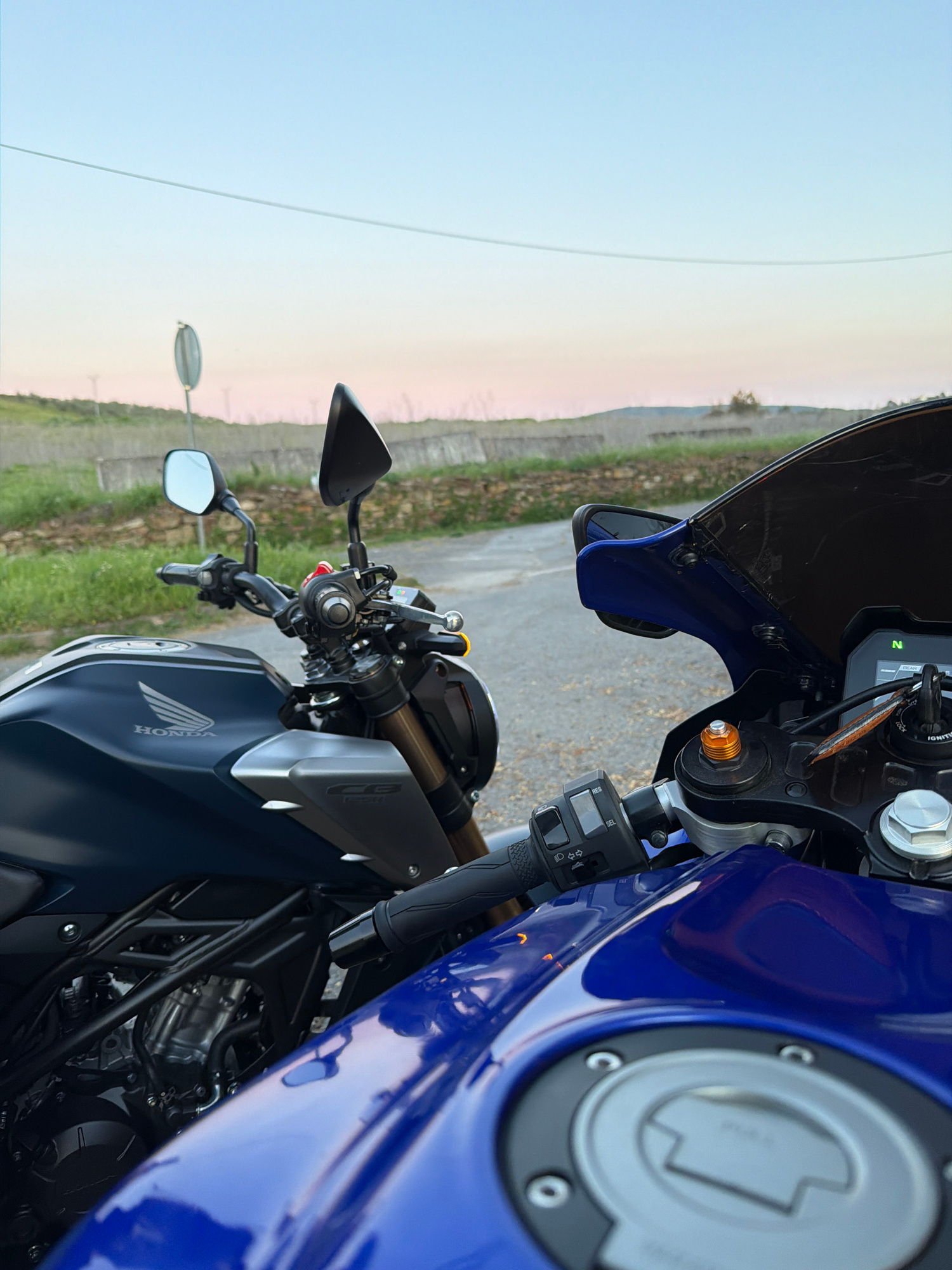 The image shows two motorcycles parked next to each other on a paved road. The motorcycle closer to the viewer is a dark blue Honda CB650R. The other motorcycle, partially visible, is a blue Yamaha R7…read more