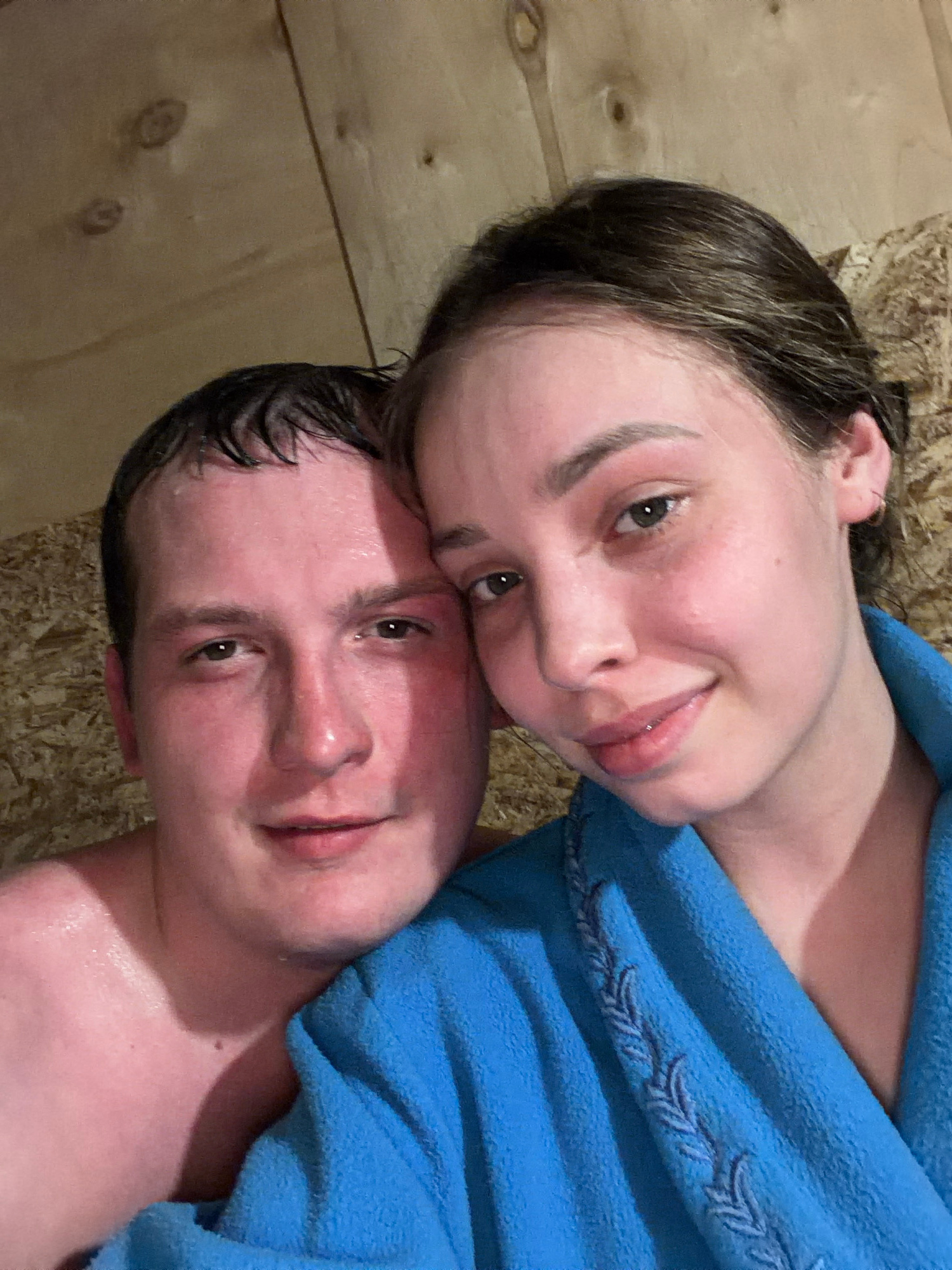 Two individuals are visible, a woman with damp dark brown hair lies above a man with wet, dark hair. The woman is smiling slightly, and her head rests on the man's. The man also appears to be smiling…read more
