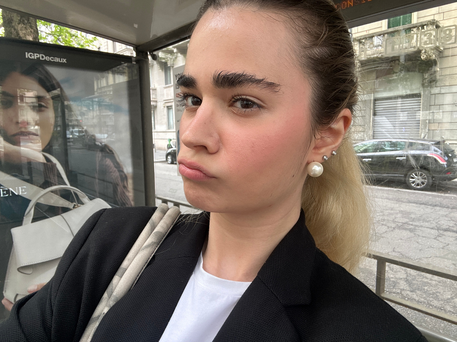 A vertically-oriented medium shot depicts a woman standing near an advertisement display in an urban environment. The advertisement display features the text "IGPDecaux". The woman has fair skin, dark…read more