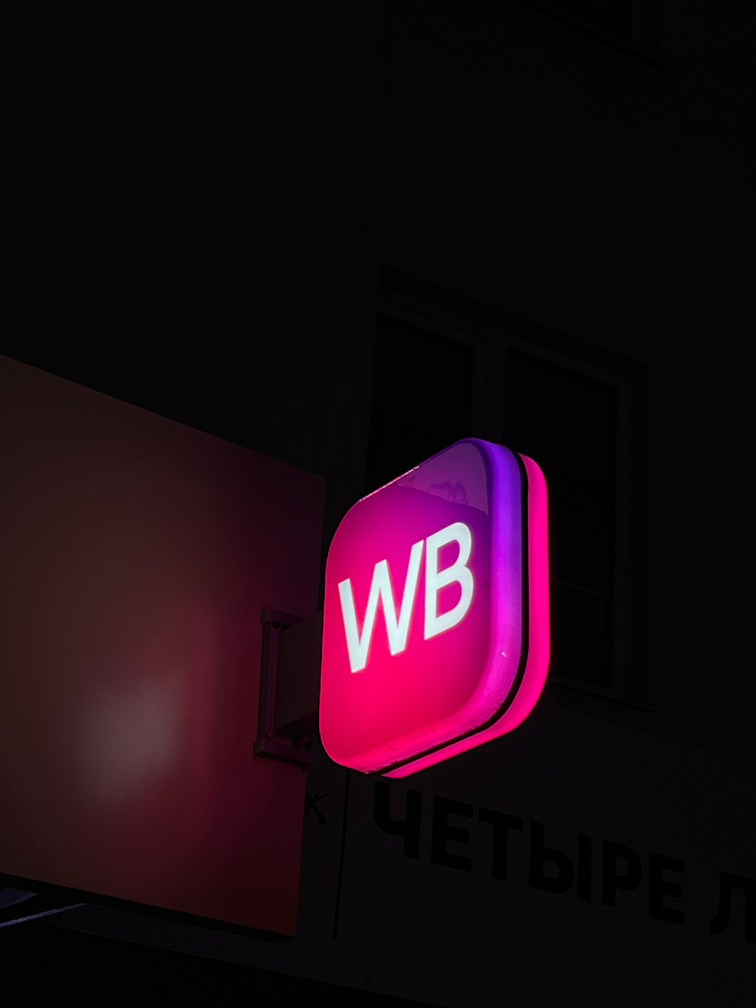 The image shows a neon sign with the letters "WB" in white on a pink background, illuminated against a dark backdrop. The sign is mounted on a structure with a reddish-brown surface. To the right of t…read more