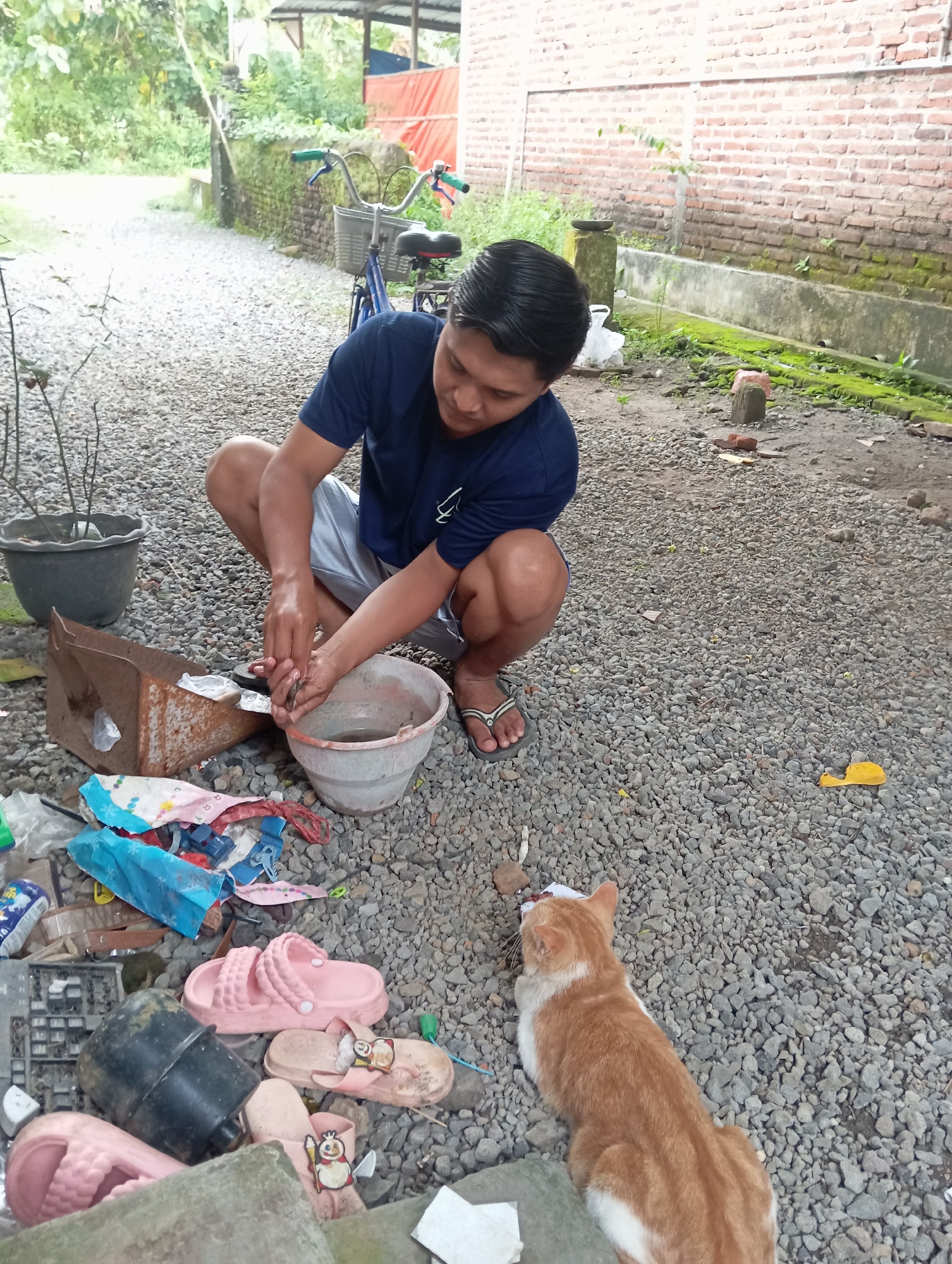 A man squats in an outdoor area covered with small gray gravel. He wears a navy blue t-shirt, gray shorts, and sandals, and appears to be cleaning or working with a bucket and a metallic object. Nearb…read more