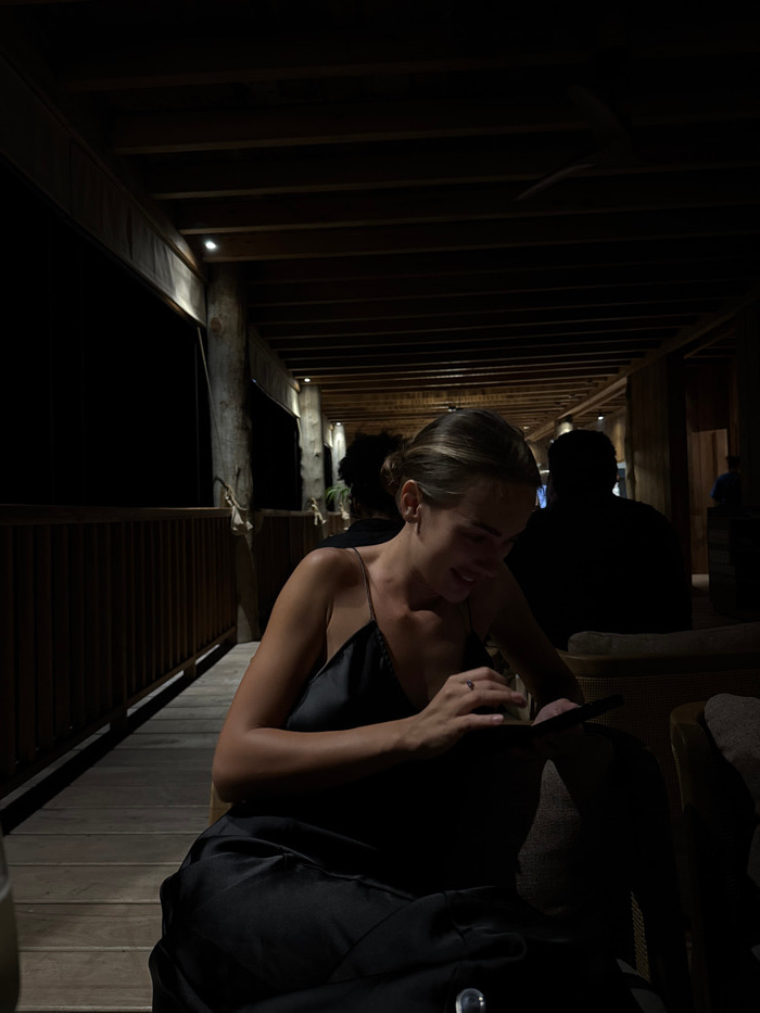 A low-angle shot frames a woman in a dark dress. She smiles, her hand raised with a ring visible. Behind her, a silhouette of another person appears. The setting seems to be a wooden structure with ve…read more