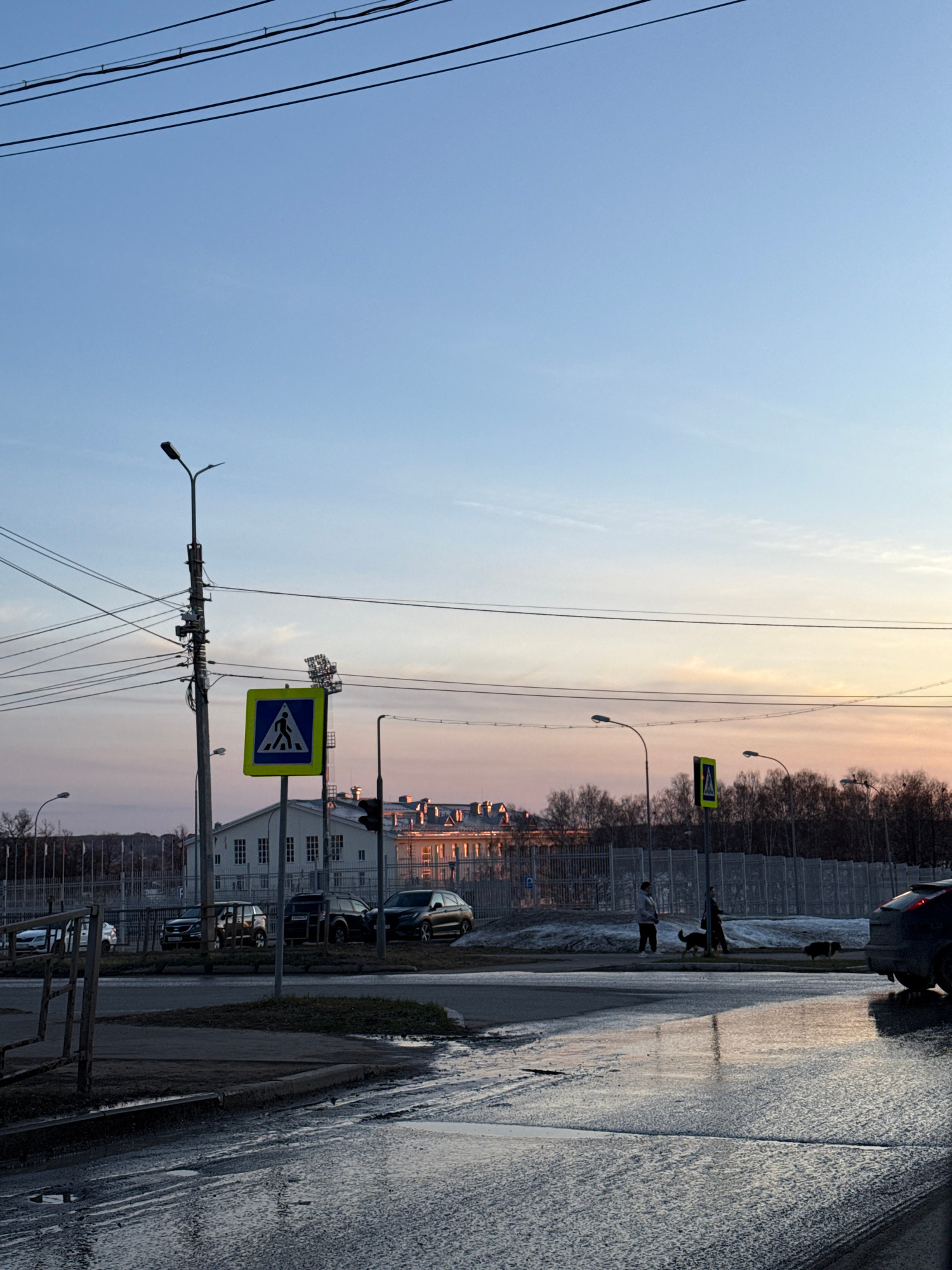 The image captures a street scene in Votkinsk, Russia, during twilight. The road is wet, reflecting the sky's soft colors. A pedestrian crossing sign stands prominently in the foreground. The sky is a…read more