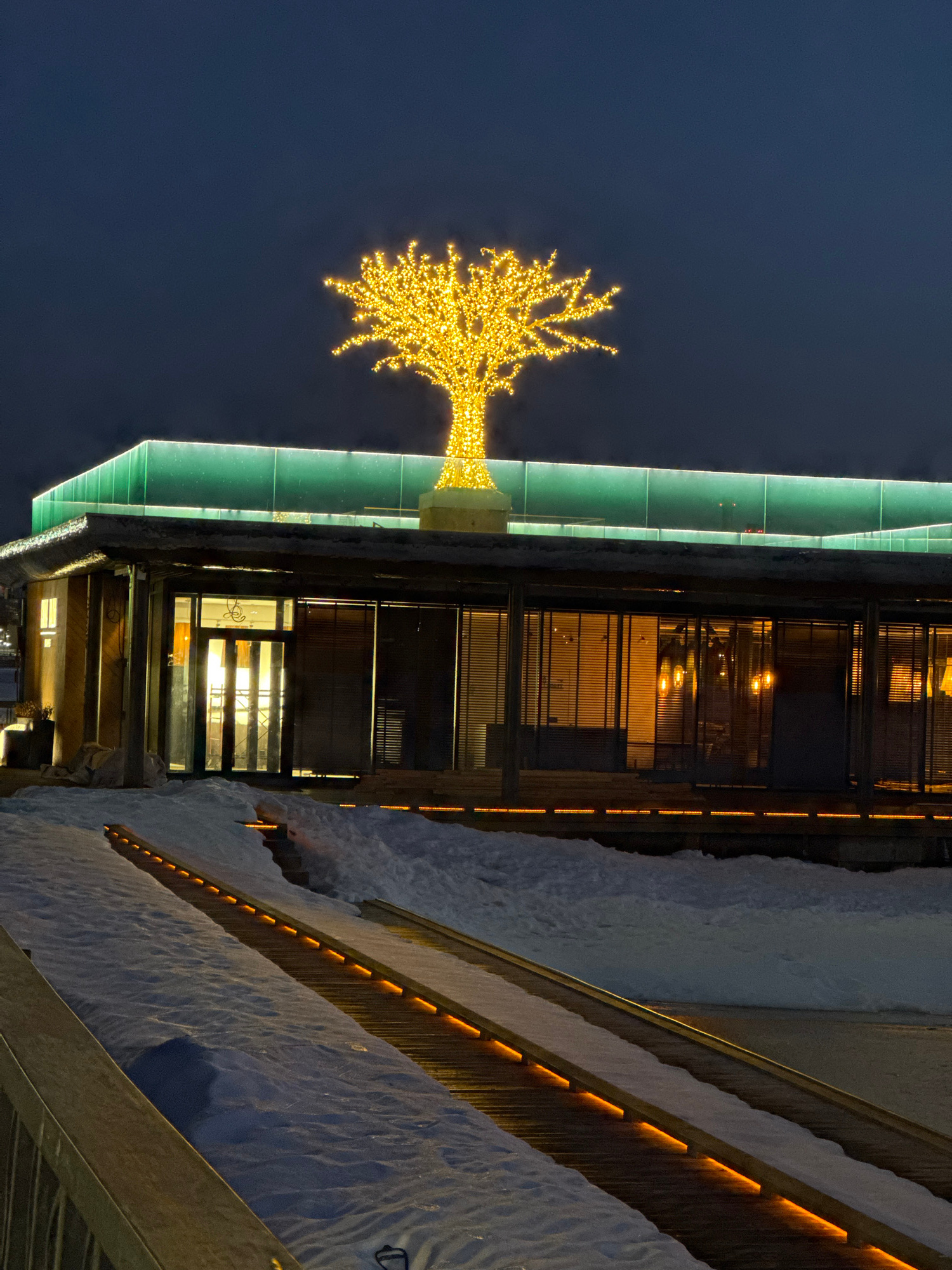 The image shows the exterior of a building at night in what appears to be a snowy location, likely in Votkinsk, Russia. A lit tree-shaped structure adorns the side of the building. The building has mu…read more