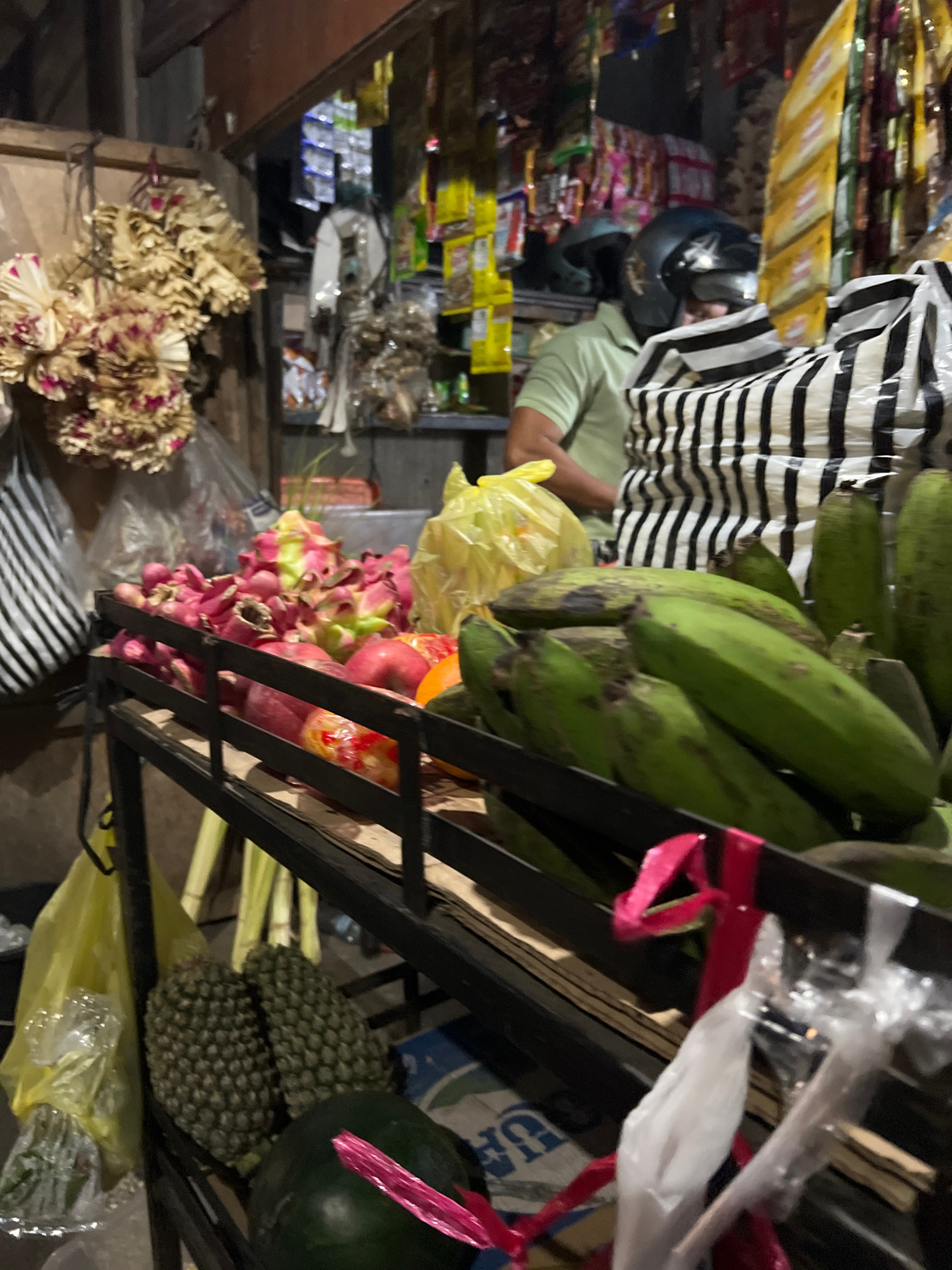 A low-angle shot of a vendor's stall in Ubud, Indonesia, displays an array of fruits: bananas, dragon fruit, oranges, pomegranates, pineapples, and watermelons. An individual wearing a striped shirt,…read more