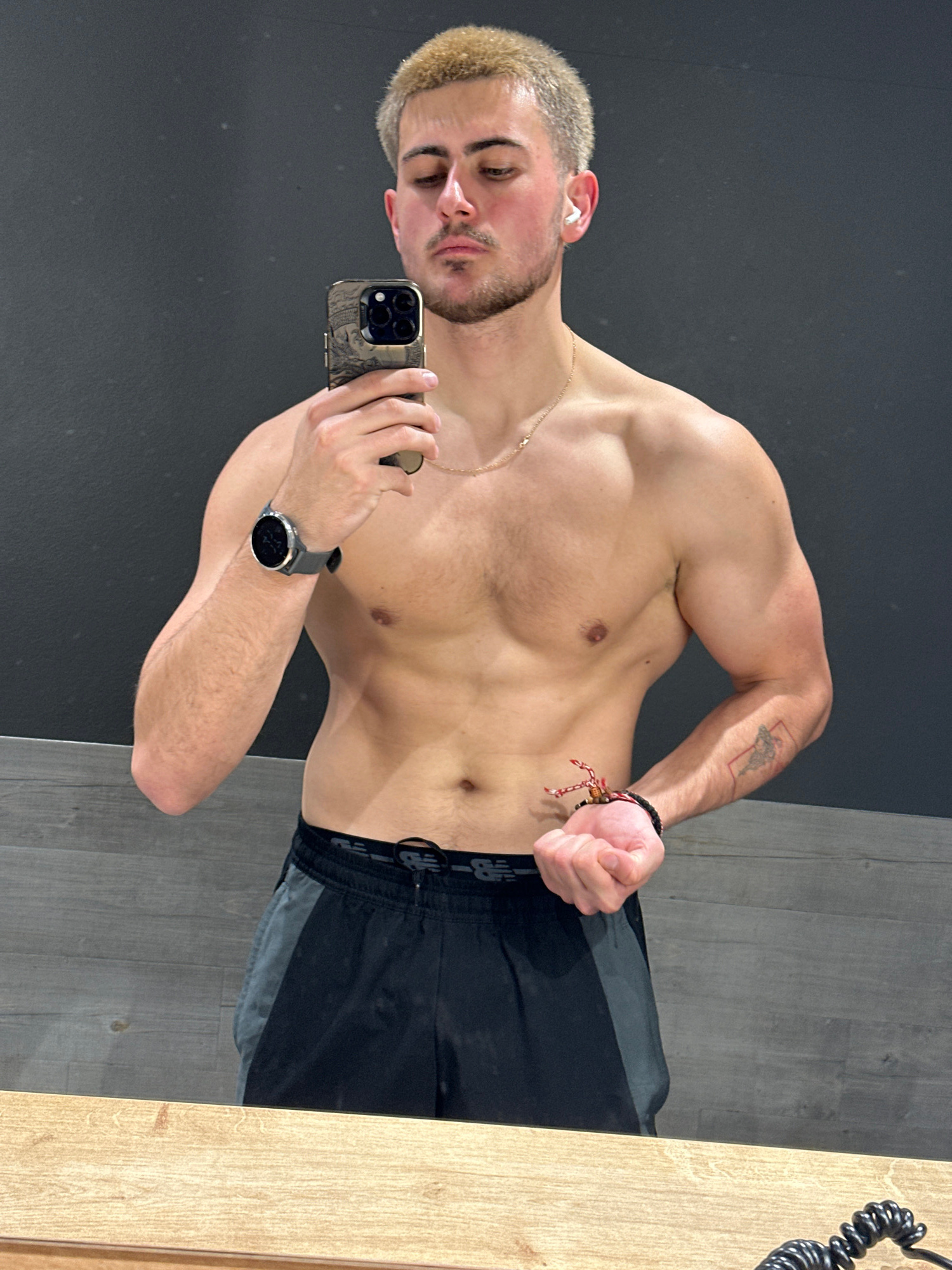A shirtless man with light-colored hair is taking a selfie in front of a mirror. He is wearing a watch on his left wrist, a gold chain around his neck, and bracelets on his right wrist. He is also wea…read more