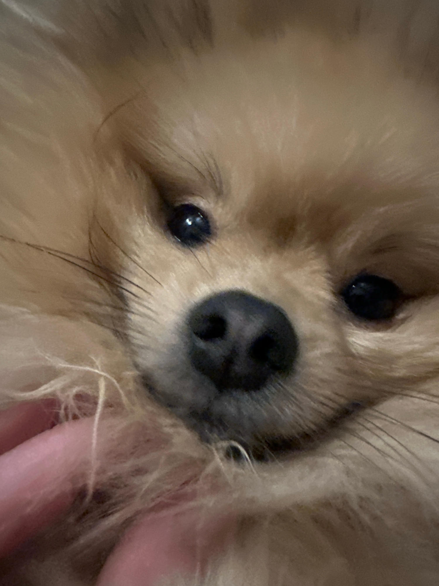 A close-up, intimate shot captures the face of a fluffy, light-colored dog, likely a Pomeranian, looking directly into the camera. The dog's prominent features include large, dark, round eyes that ref…read more