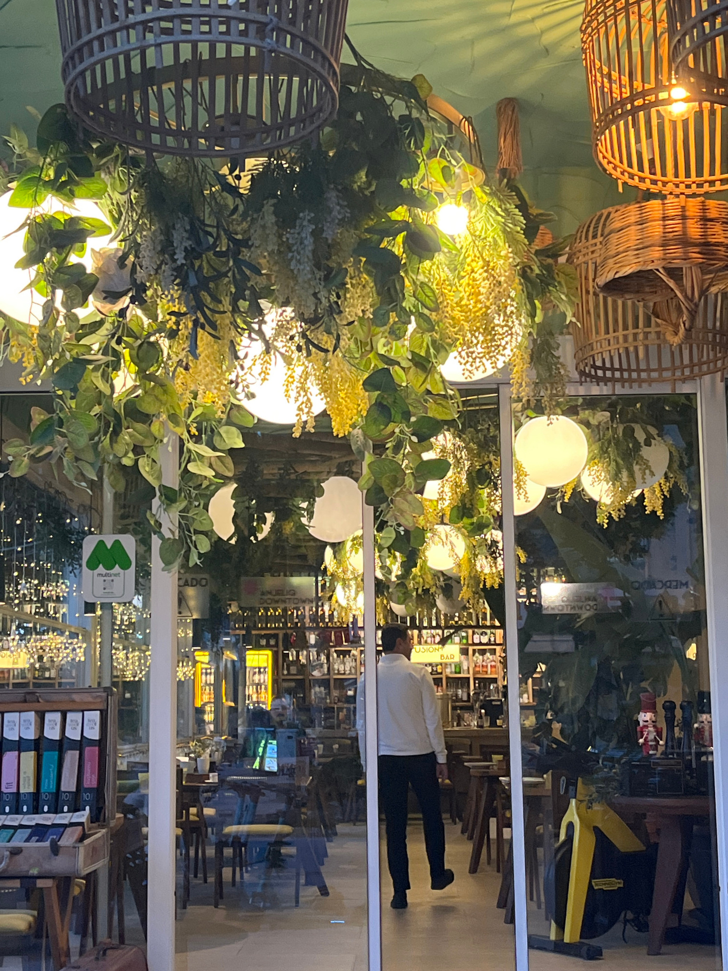 The scene captures the exterior of a business in Alanya, Turkey, as viewed through a glass facade. The interior is decorated with lighting fixtures, woven baskets, and artificial foliage. A person wea…read more