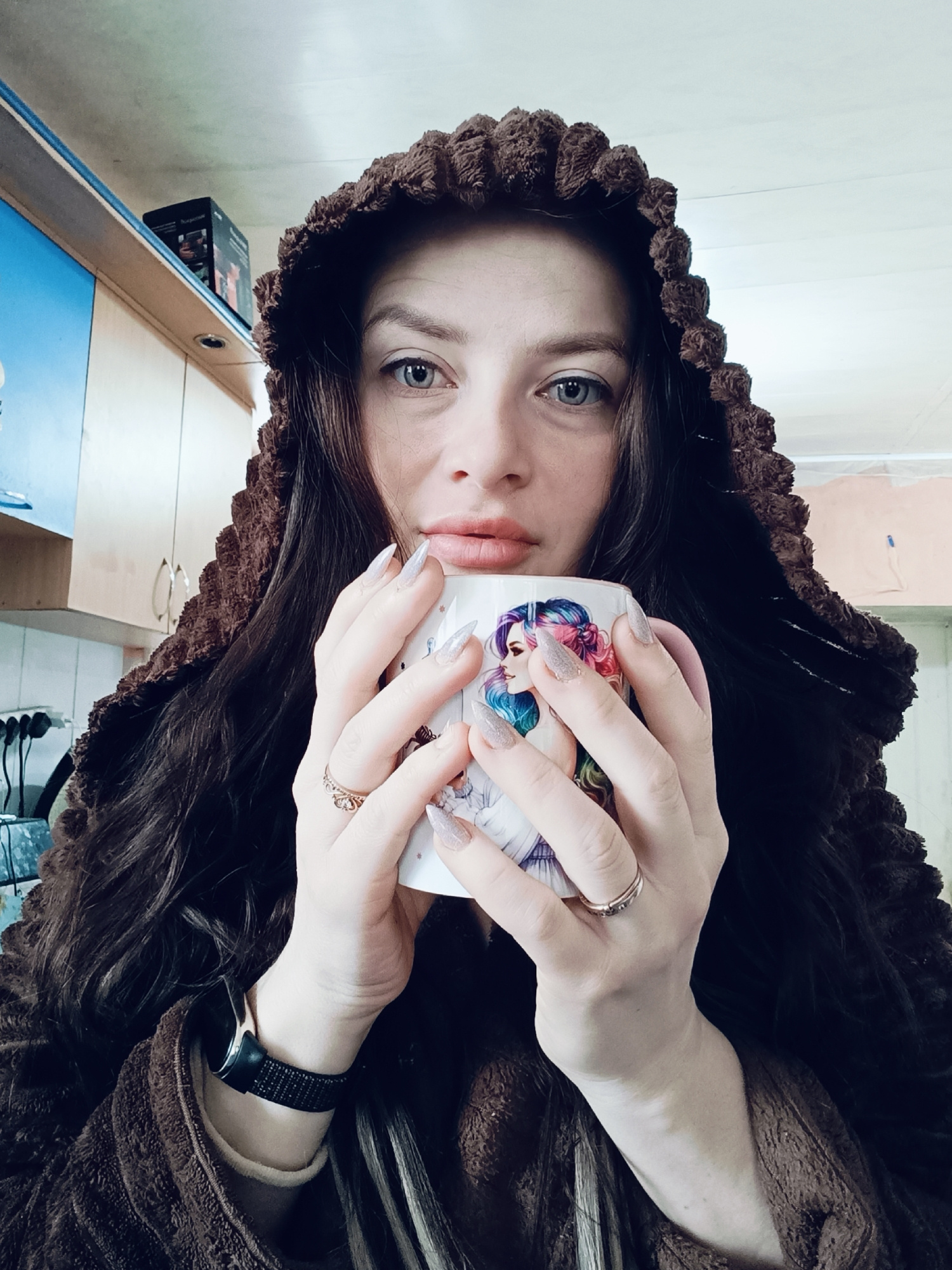 A woman with blue eyes and long, dark hair wearing a brown hooded robe is holding a mug with a colorful illustration of a woman on it. She is wearing rings on her fingers and a black watch on her left…read more