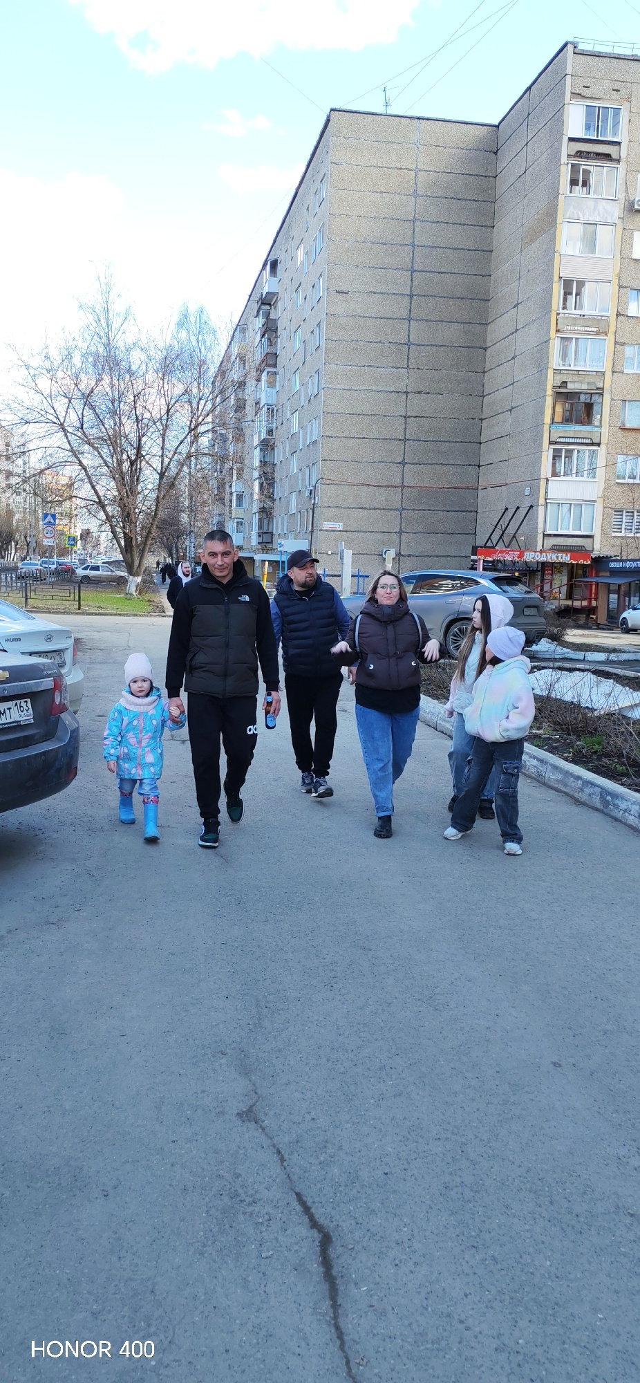 A group of six people is walking down a sidewalk in Izhevsk, Russia. A man in a black jacket and black Adidas pants is holding the hand of a small child in a blue snowsuit. Behind them are a man in a…read more