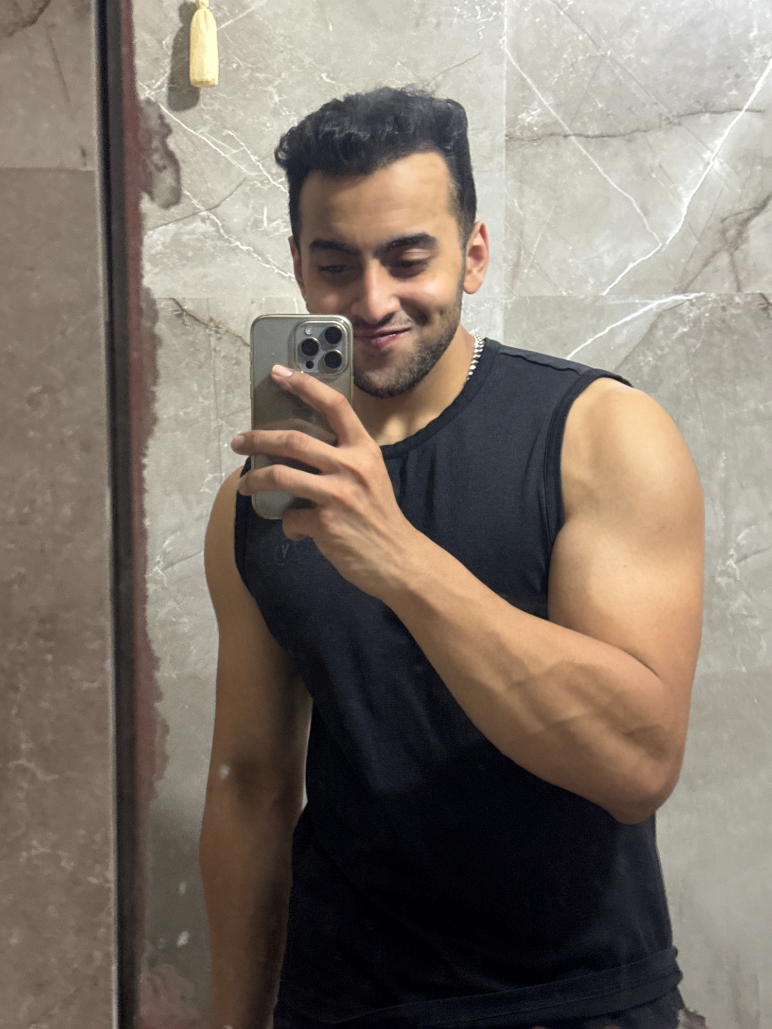 A man is taking a selfie in a bathroom with gray marble walls. He is wearing a black tank top and holding an iPhone with three lenses in his right hand. There is a small, pale yellow object to his lef…read more