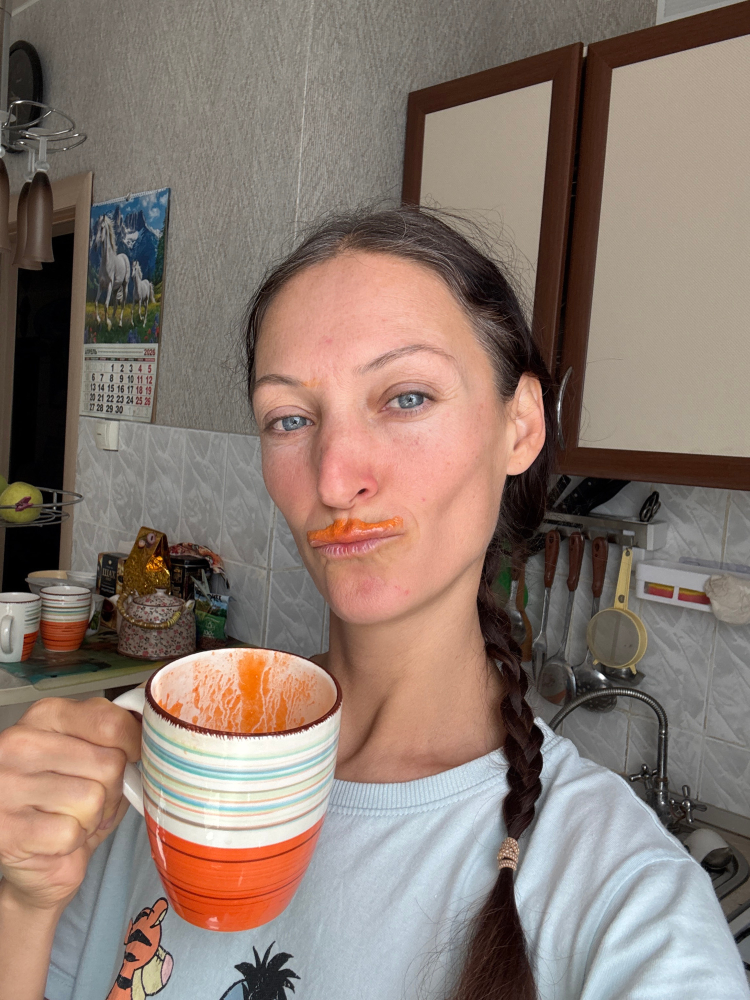 A casual portrait captured in a domestic kitchen, likely in Ulyanovsk, Russia, shows a woman with dark hair tied in a braid and clear blue eyes. The image is tilted, presenting her face slightly upwar…read more