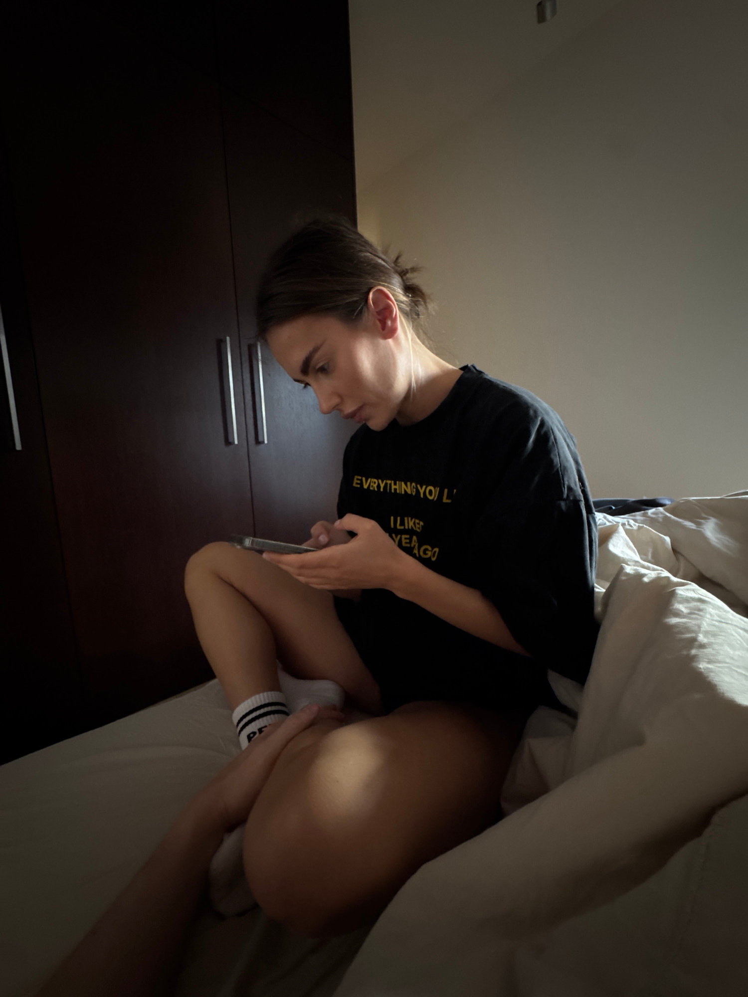 A person with shoulder-length brown hair is sitting on a bed with white linens in an indoor space. The person is wearing a black t-shirt with gold lettering and white socks with black stripes. They ar…read more