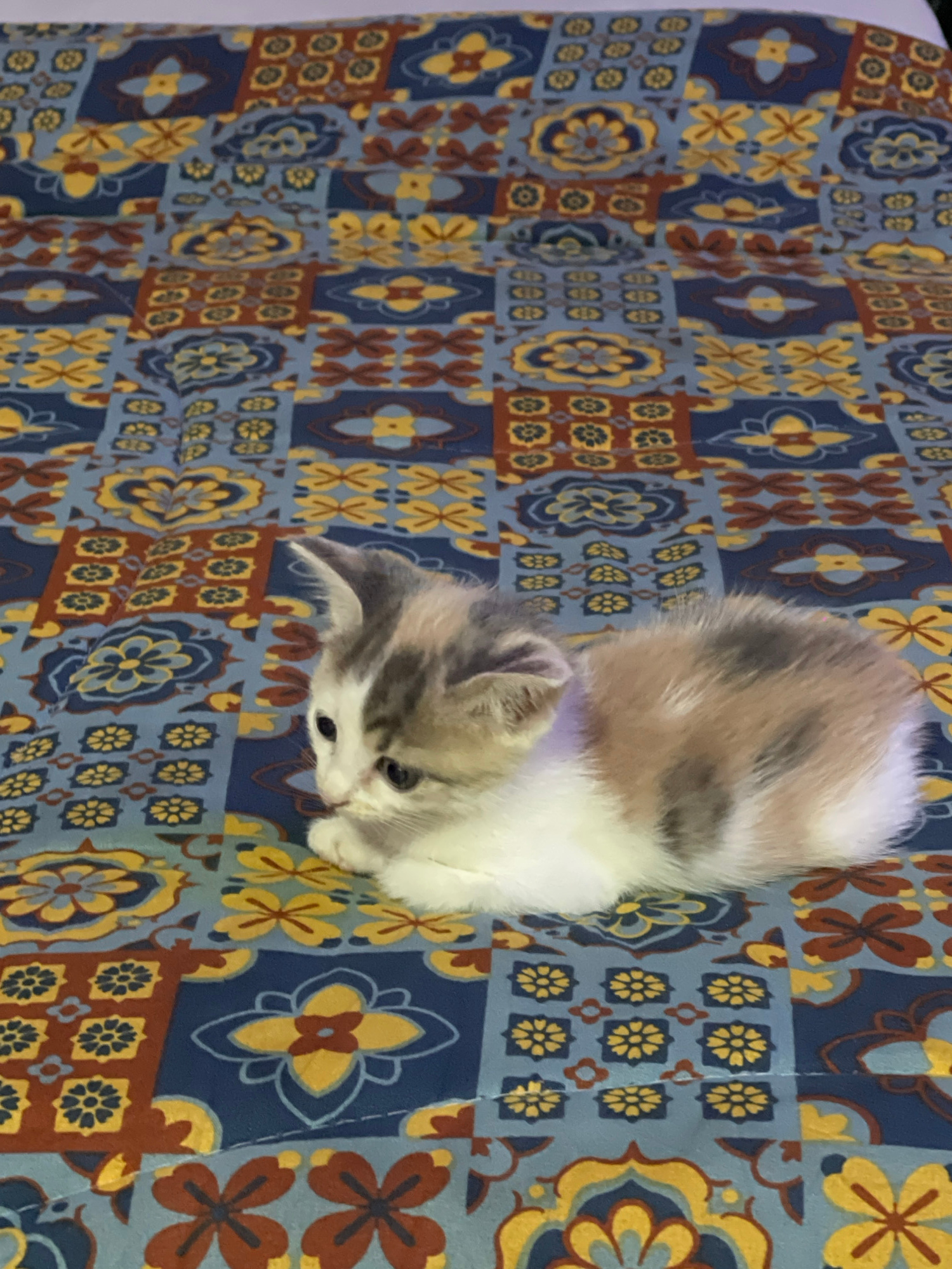 A small, light-colored kitten with gray and white fur sits on a patterned fabric surface, likely a bedspread or blanket. The pattern consists of repeating geometric designs in shades of blue, yellow,…read more