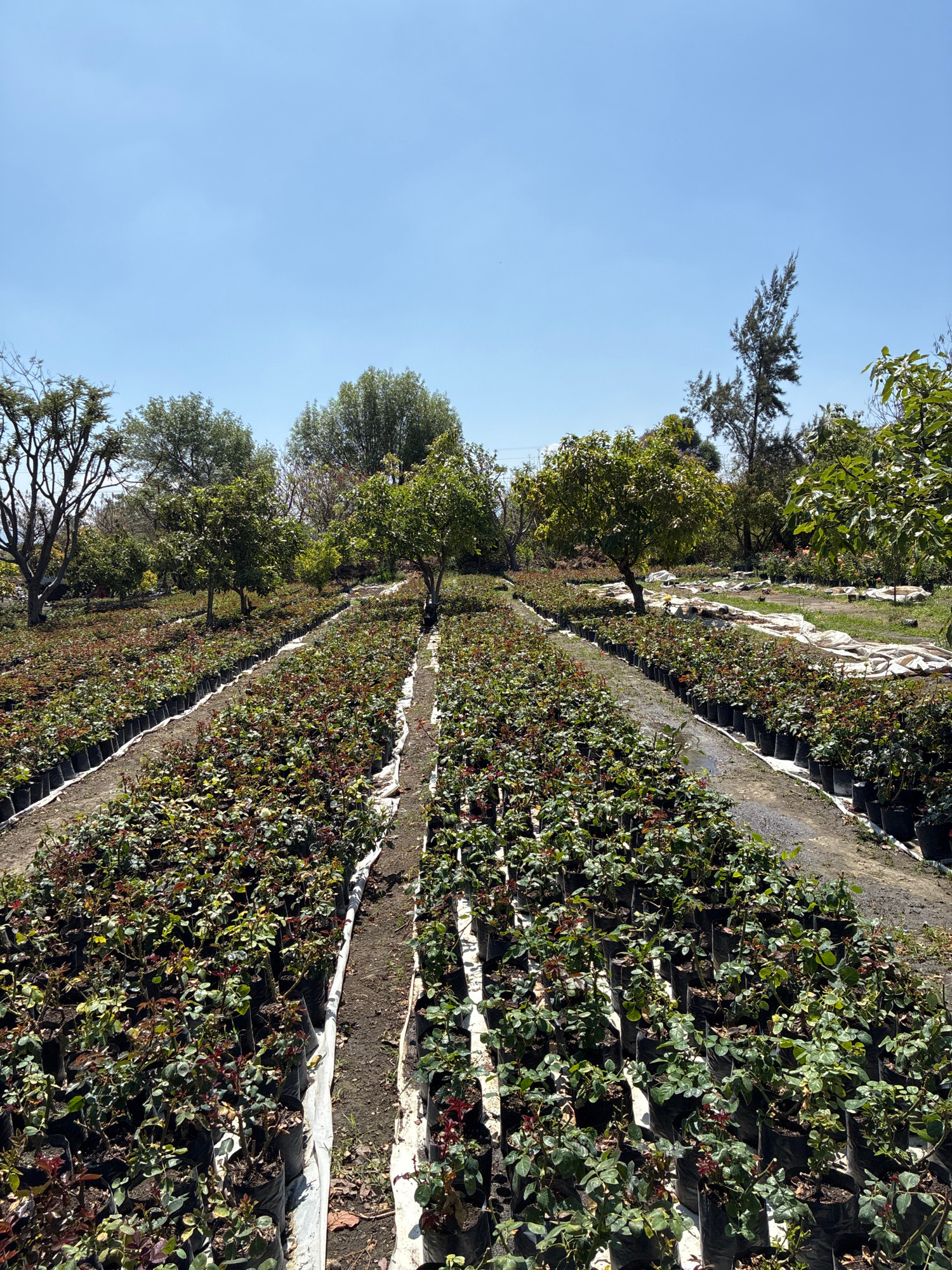 The image shows a field of potted plants, likely roses, in an agricultural setting in Atlixco, Mexico. The rows of pots are lined with white fabric. Trees are scattered throughout the landscape, and t…read more