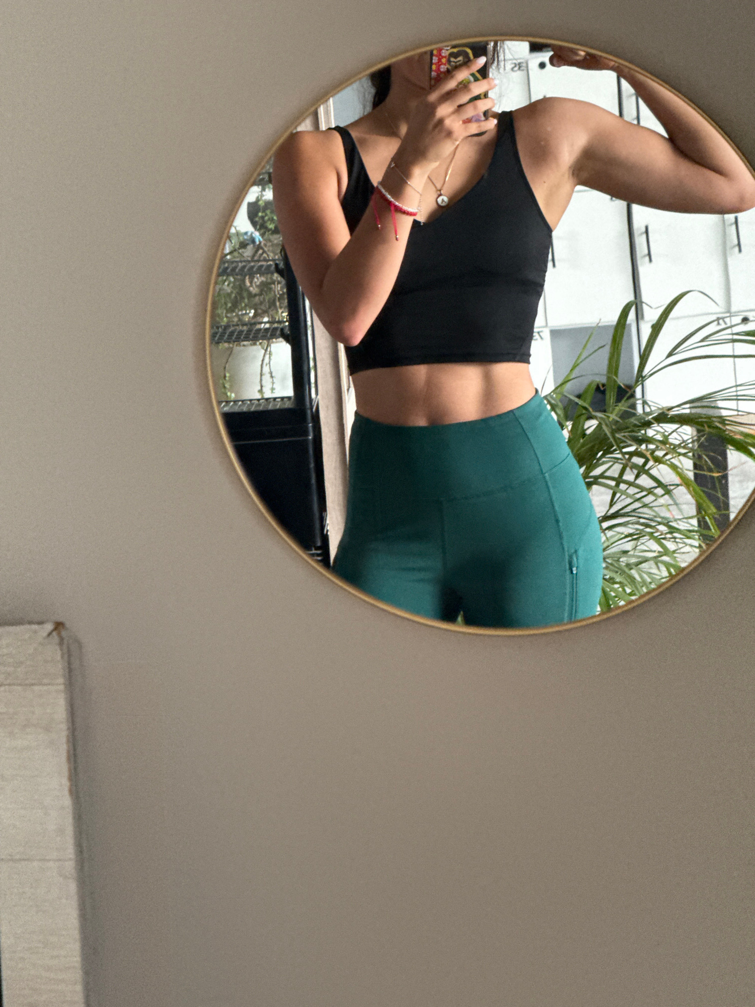 A woman in a black tank top and teal leggings is reflected in a round mirror. She is holding a phone in her left hand, and her right arm is raised. The background visible through the mirror includes a…read more