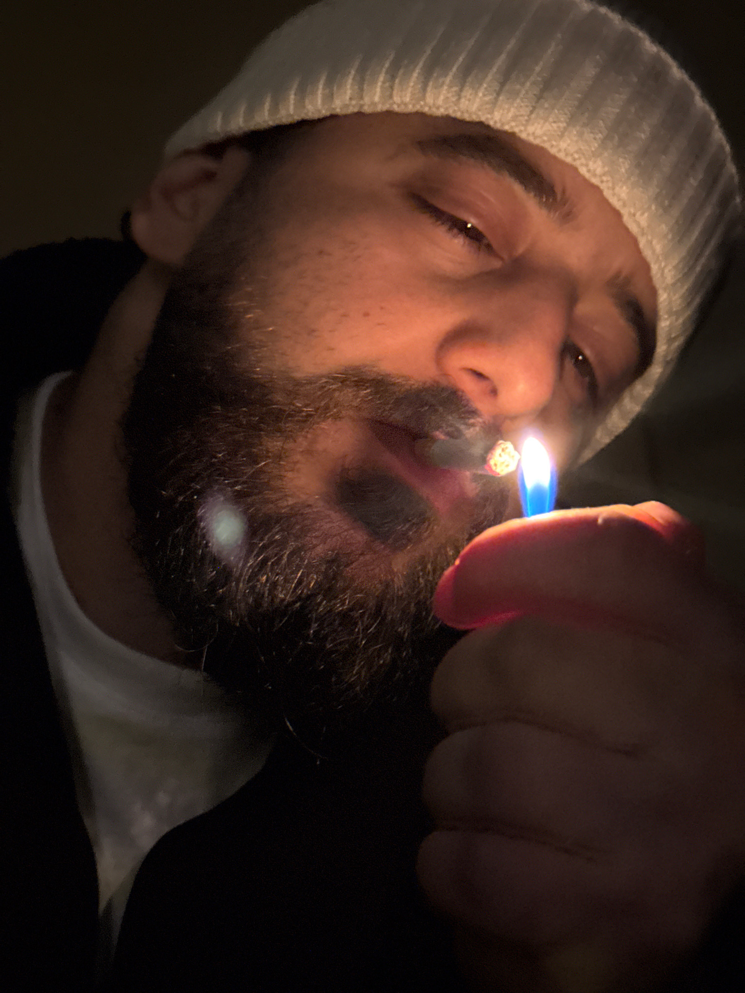 A medium shot depicts a man with a beard, wearing a white beanie, lighting a cigarette in a dimly lit environment. The source of light emanates from the flame of the lighter held close to the cigarett…read more