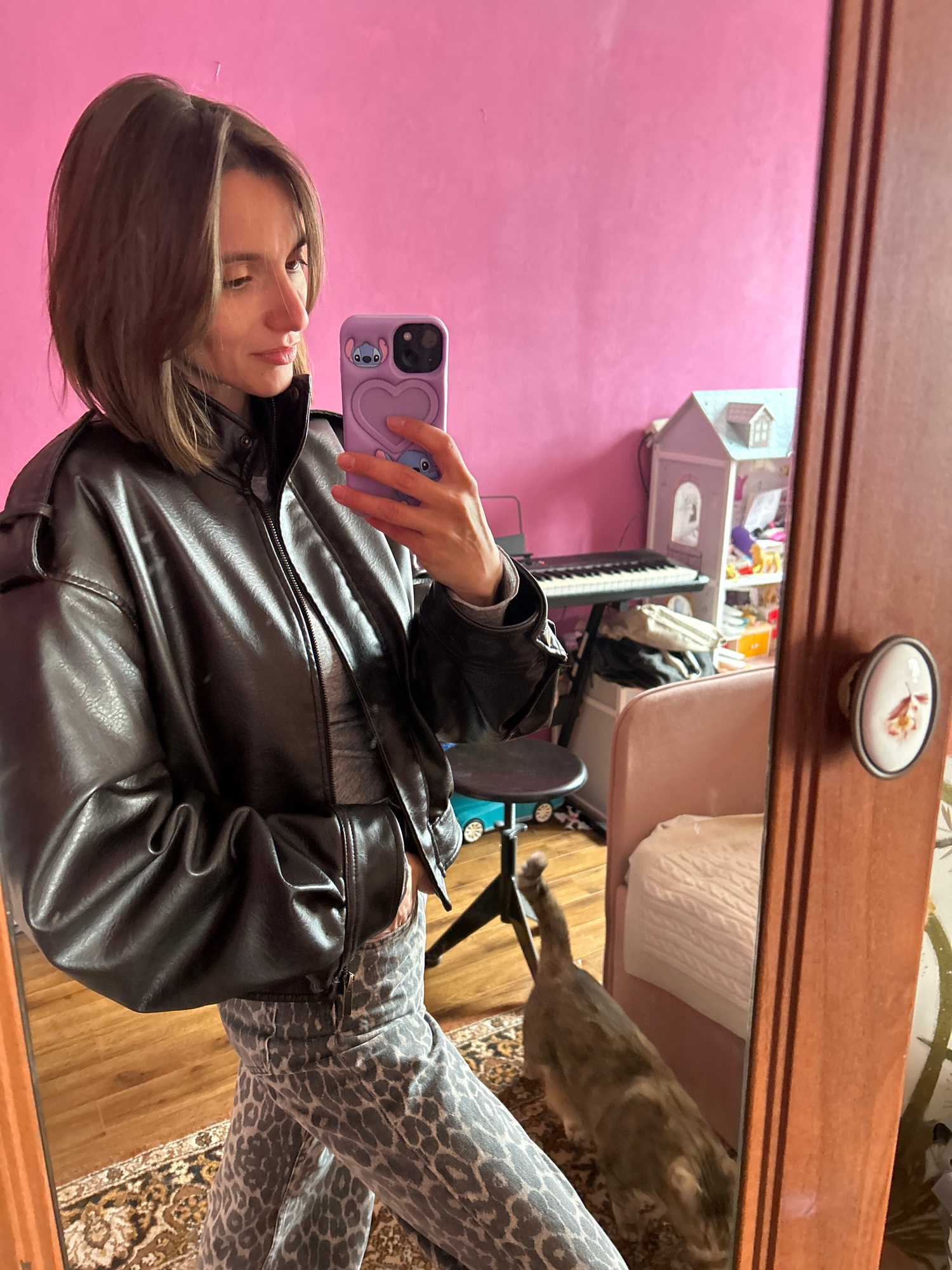 A person takes a selfie in a mirror. The person has brown hair, a leather jacket, and leopard print pants. The person holds a purple phone case with a blue cartoon character on it. The background show…read more