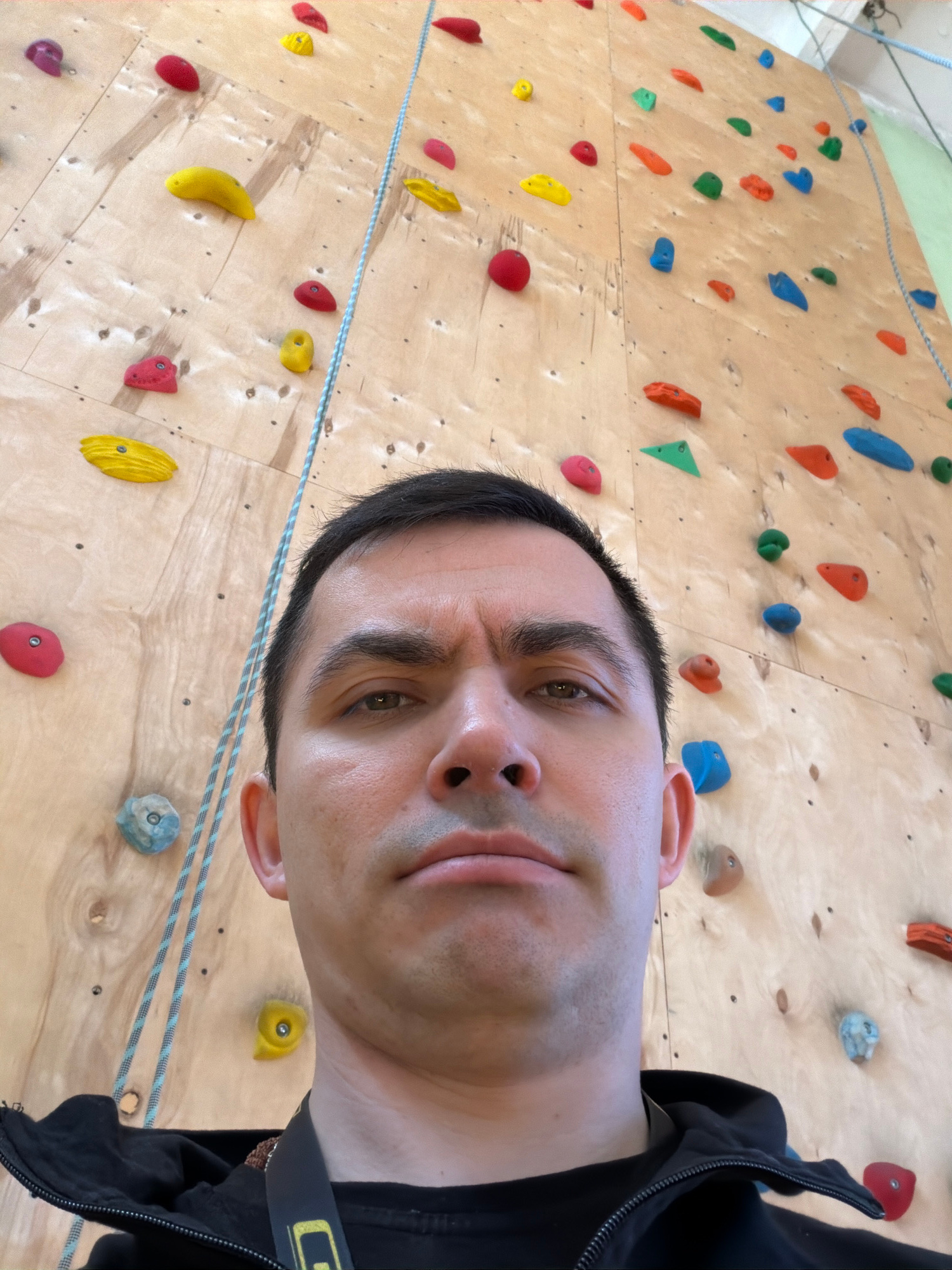 A man is taking a selfie while rock climbing. He is wearing a harness and standing in front of a climbing wall with multi-colored holds. The background appears to be a gym setting. There is no indicat…read more