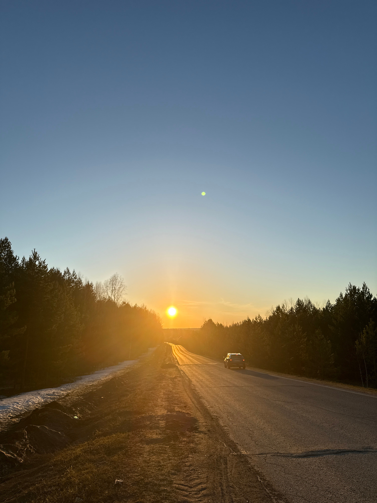 The image depicts a road alongside a wooded area at sunset. The sky is a gradient of blue to orange near the horizon where the sun is positioned. A car is visible on the road. The location is suspecte…read more