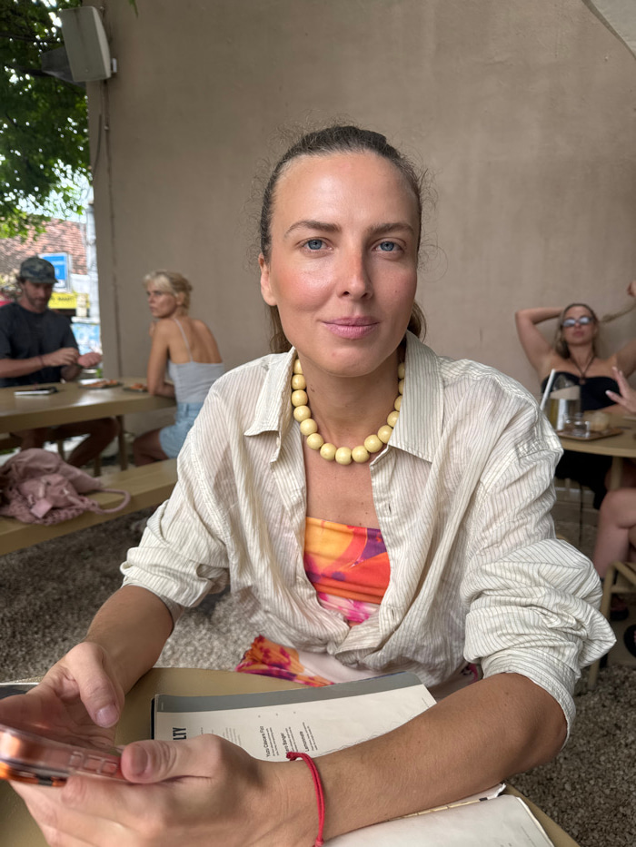 The image captures an outdoor or semi-outdoor cafe scene in Uluwatu, Indonesia. A fair-skinned woman with light blue eyes and light brown hair, pulled back, is positioned in the foreground, looking di…read more