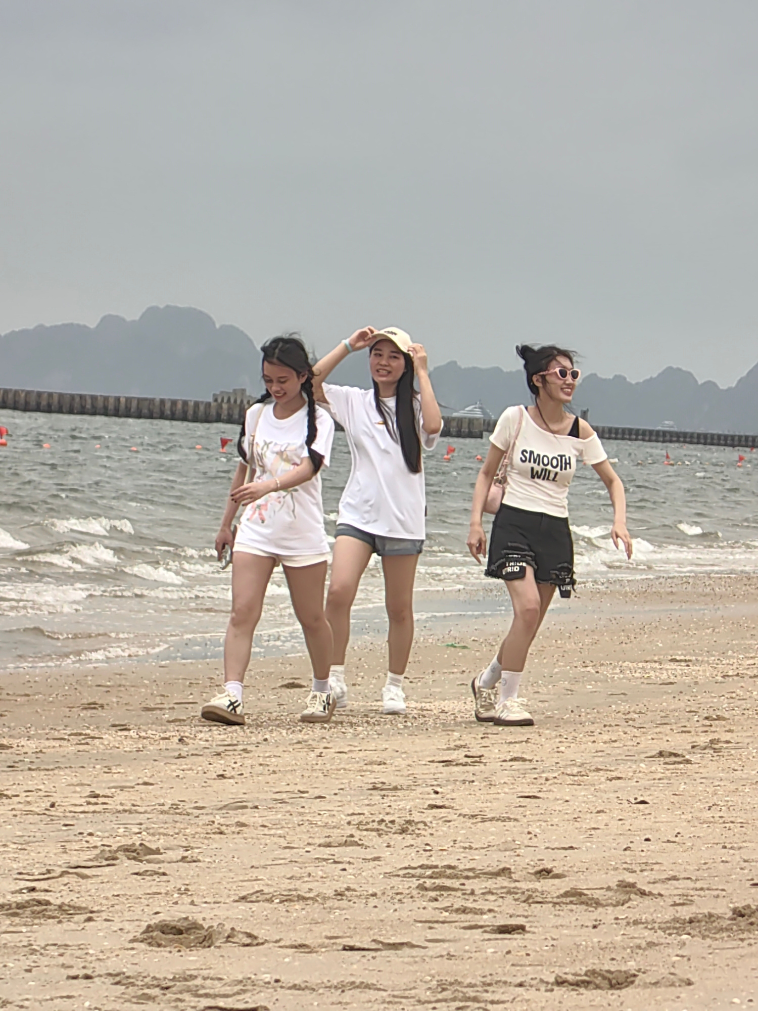 Three young women are walking on a sandy beach. The woman on the left has braided hair and wears a white t-shirt with floral designs and white shorts. The woman in the middle wears a white t-shirt, gr…read more