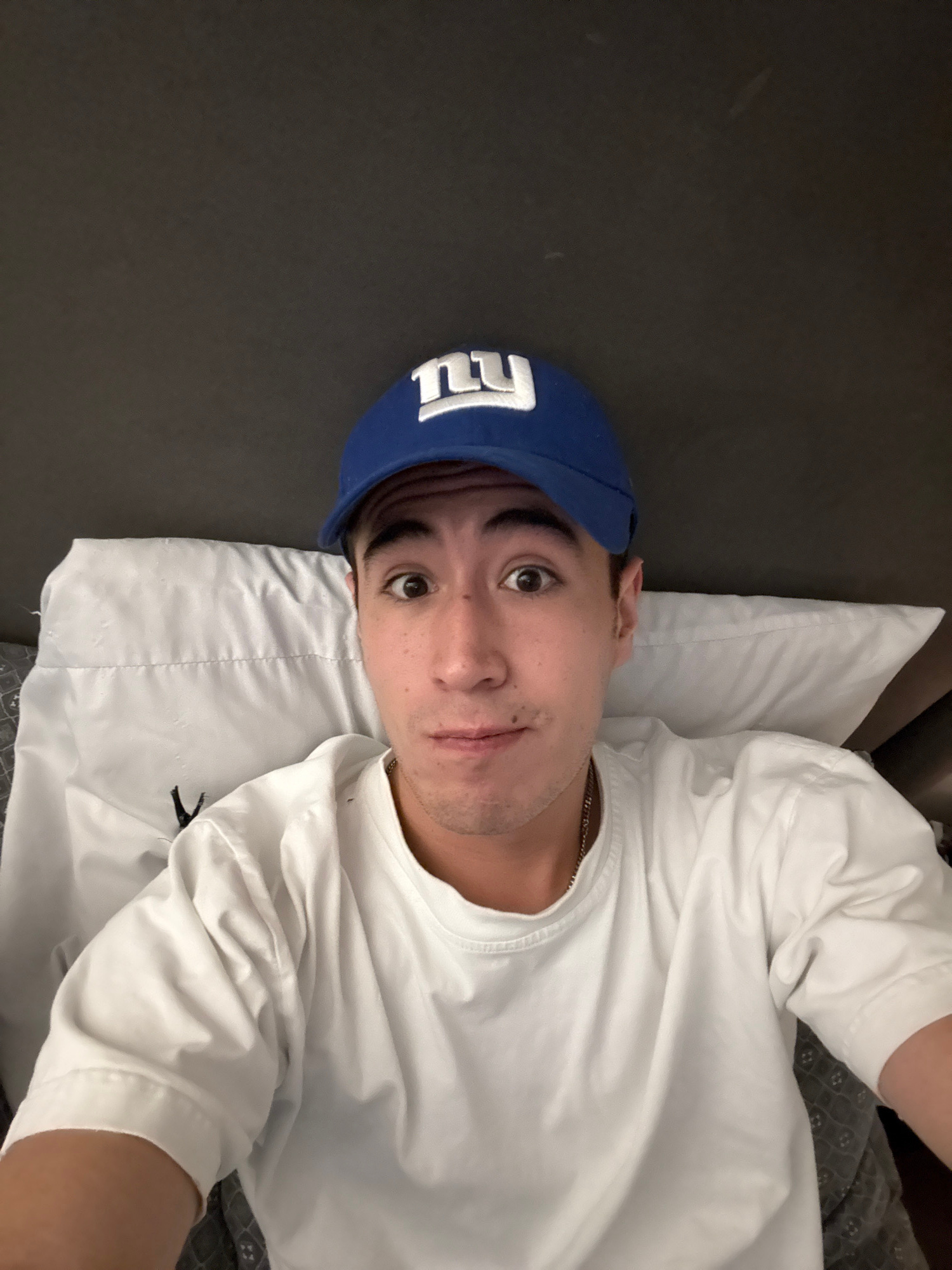 A person is lying on a white pillow on what appears to be a dark gray bed or sofa. They are wearing a white long-sleeved shirt and a blue baseball cap with a white "NY" logo. A gold necklace is visibl…read more