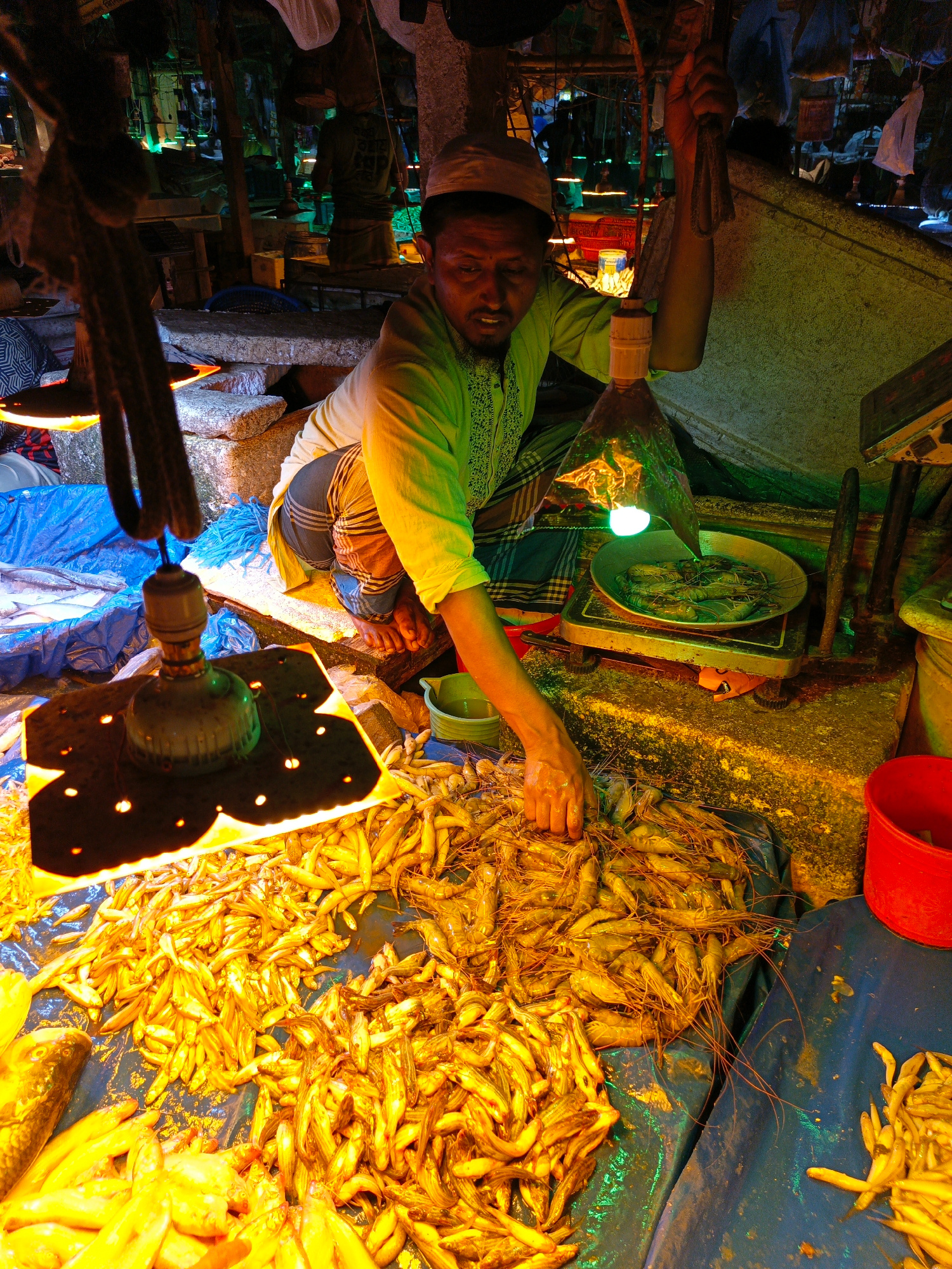 A fishmonger in Dhaka, Bangladesh, kneels at his stall sorting small, pale-yellow fish and shrimp under bright electric lights. He wears a light green embroidered shirt and a white skullcap. He is bar…read more