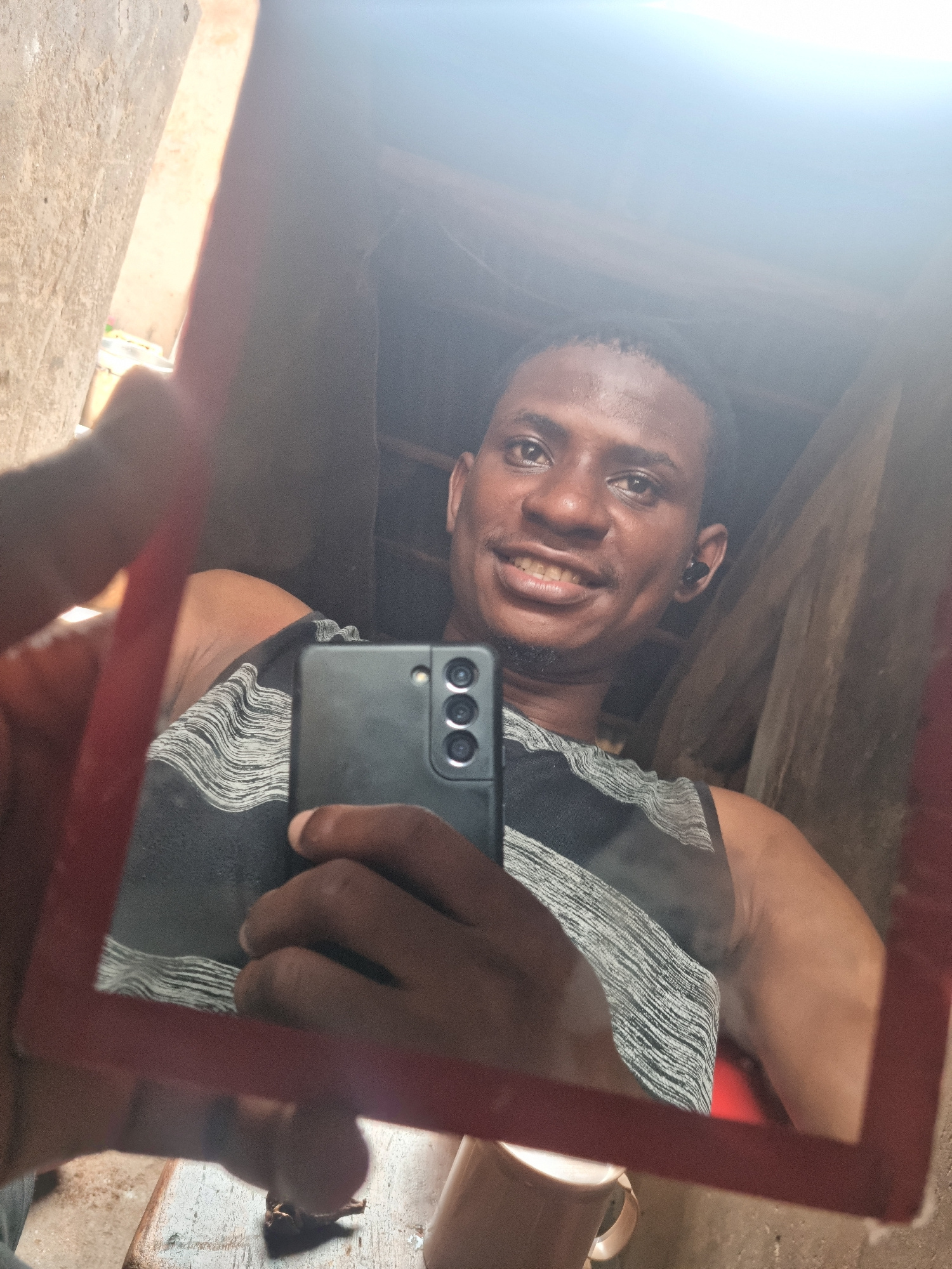 A young Black man is captured in a mirror selfie, smiling broadly with white teeth. He is looking directly at the viewer, holding a black smartphone with a triple-lens camera setup in his right hand.…read more