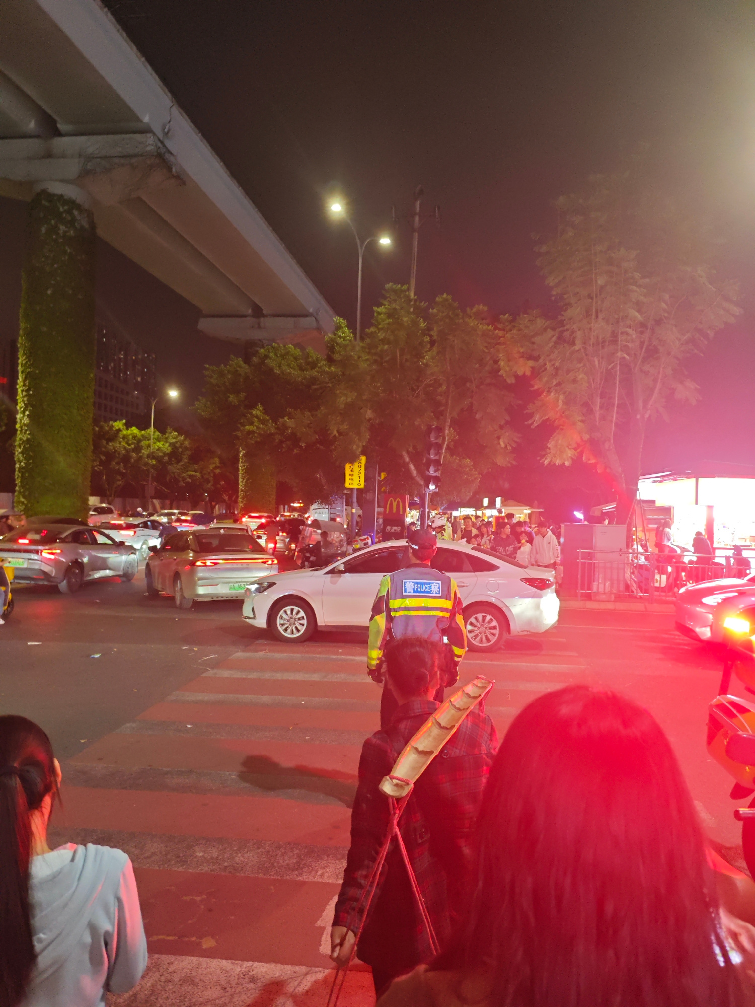 The image depicts an urban scene at night in Chongqing High-tech Zone, China. A busy intersection is filled with cars, including white sedans and silver vehicles, some with visible license plates. Ped…read more