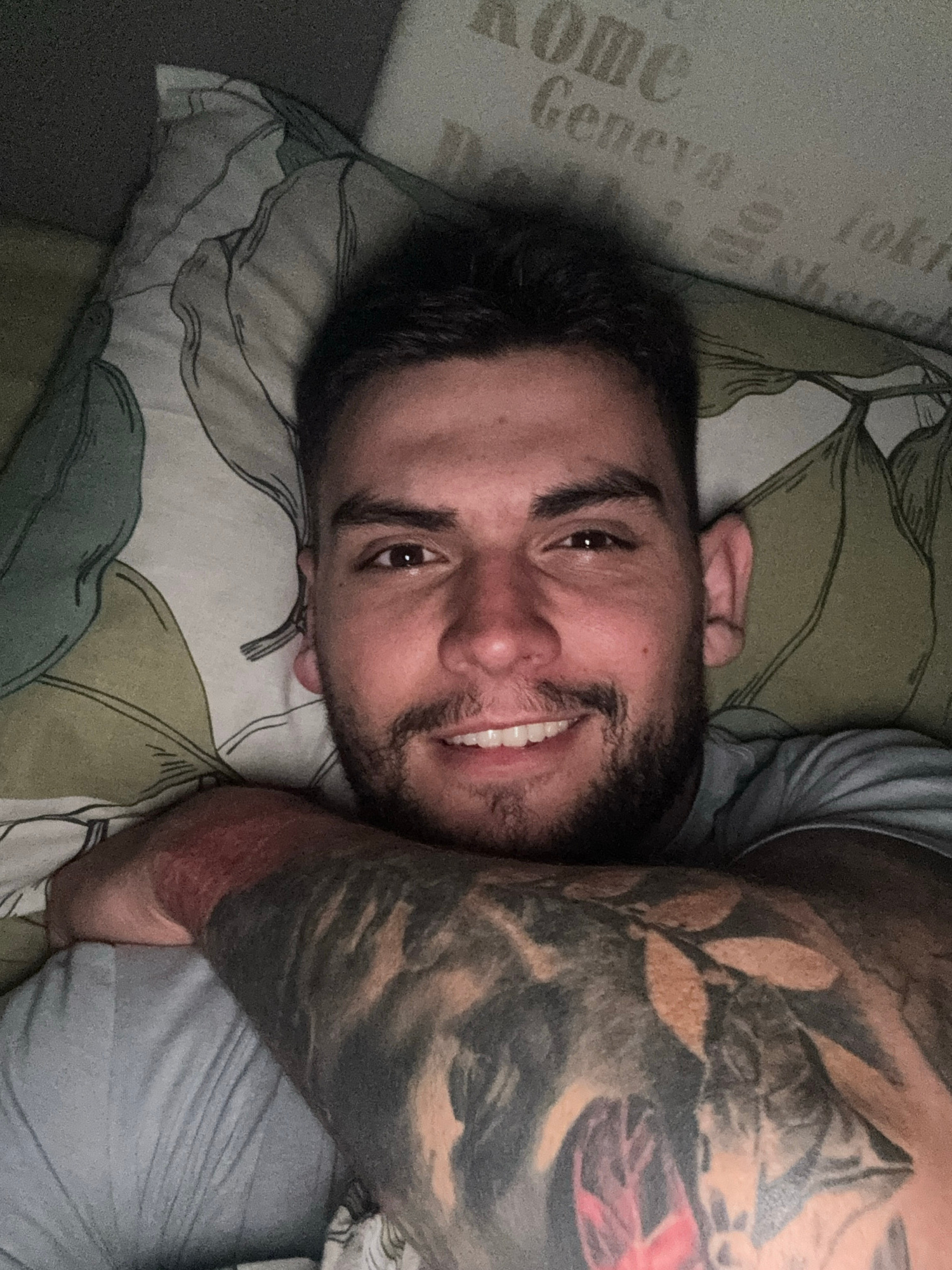 A man with a dark beard and a tattoo on his right arm is lying on a pillow. The pillow has a light-colored fabric with a leaf pattern. The background is out of focus and not enough information to dete…read more