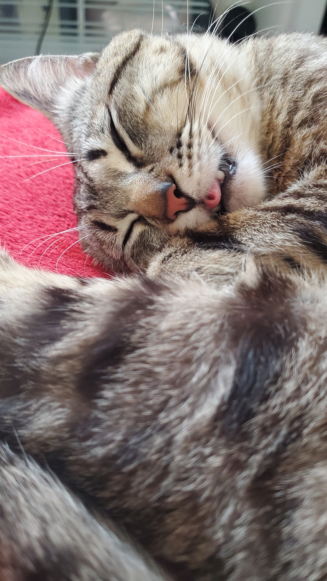 The image shows a close-up of a tabby cat sleeping on a red surface. The cat is lying on its side, with its eyes closed and its pink tongue slightly protruding. The cat's fur is a mix of brown and graβ¦read more