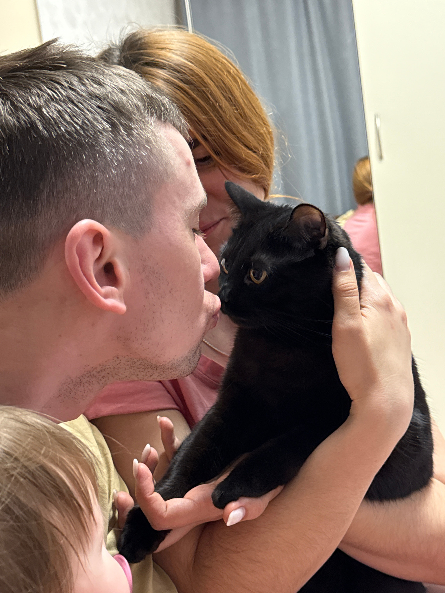 A man lies supine with a woman holding a black cat above him. The cat's face is near the man's face. The location is unknown and there is no indication it is in Krapivka, Russia.
