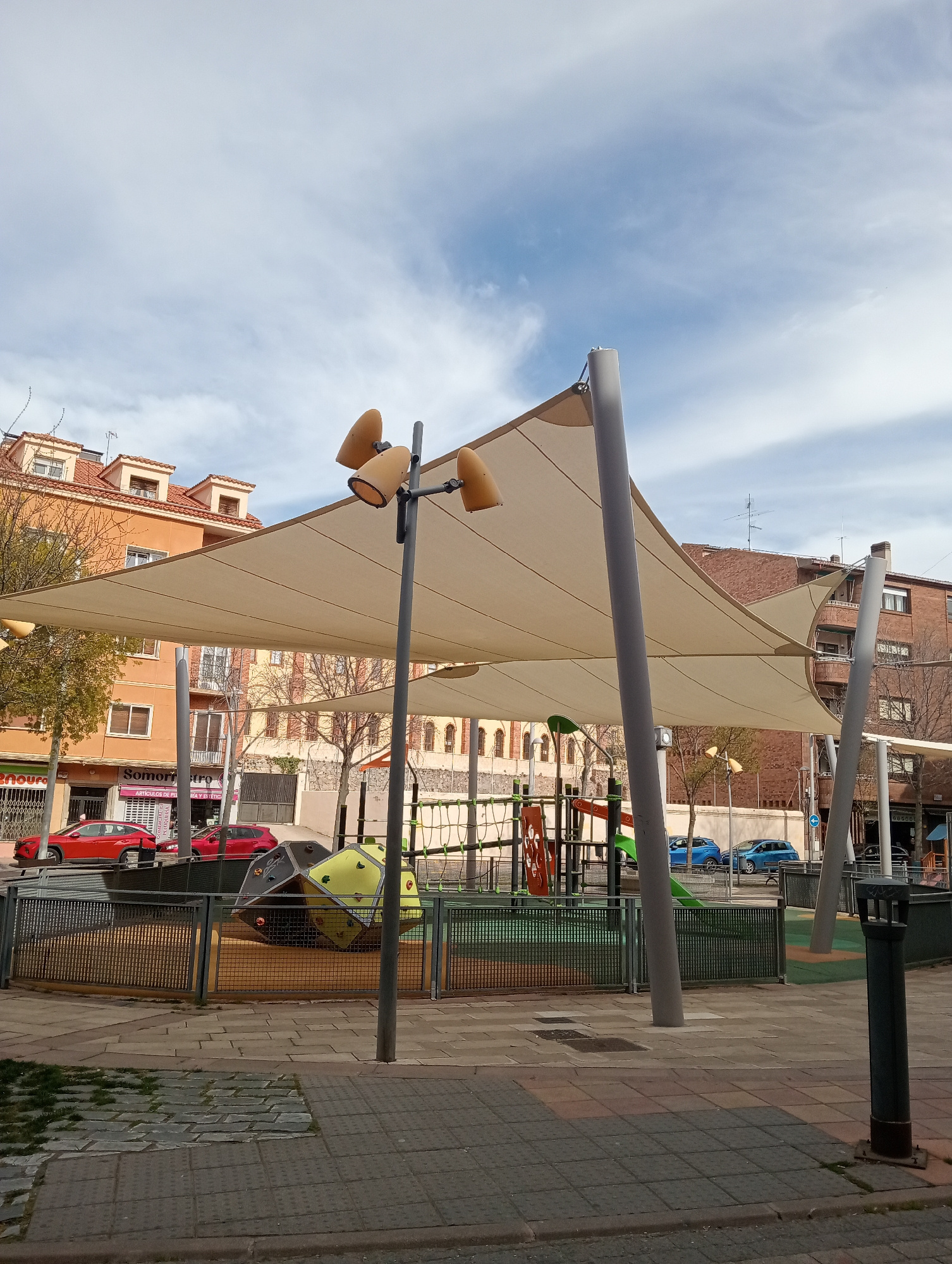 The image shows a playground in Segovia, Spain. The playground is fenced and covered with a tan shade sail supported by metal poles. Within the playground, there's a climbing structure and other play…read more