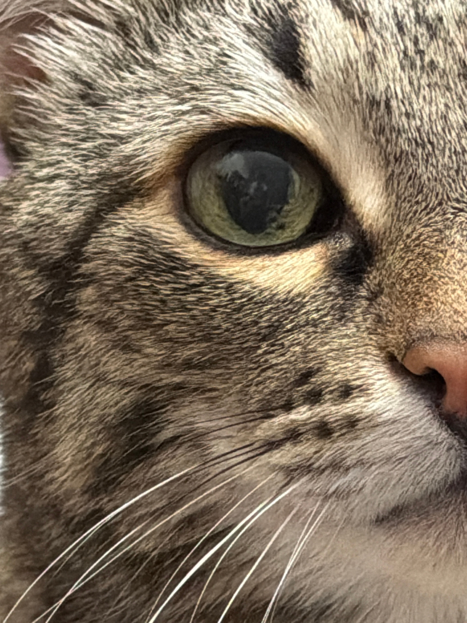 Close-up view of a cat's face, focusing on the eye, nose, and surrounding fur. The cat has grey and brown striped fur. The eye is green with a dark pupil. White whiskers are visible. The cat's pink no…read more