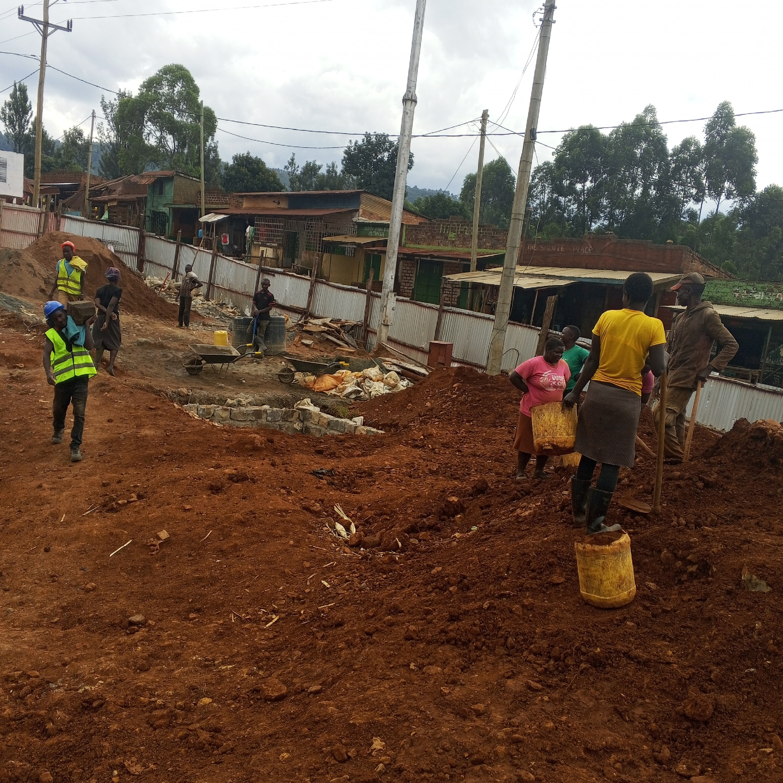 The image depicts a vibrant, open-air construction or earthmoving site in Borabu Chitago ward, Kenya, under an overcast sky. The dominant feature is the reddish-brown soil, signifying extensive ground…read more