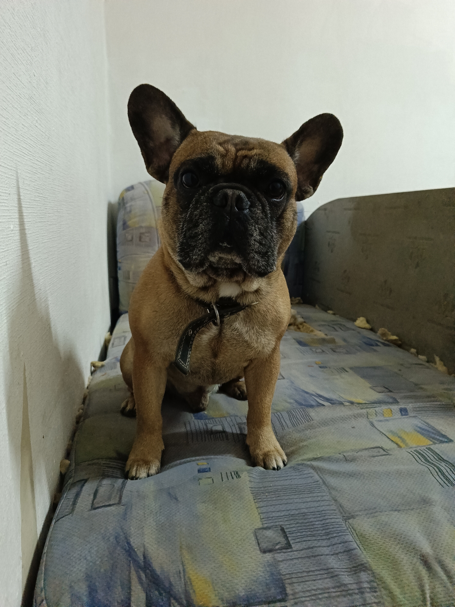 The image captures a fawn-colored French bulldog seated indoors, in Rusalevka, Russia. The dog, with its distinctive black muzzle and large, alert ears, is positioned centrally and faces directly towaβ¦read more