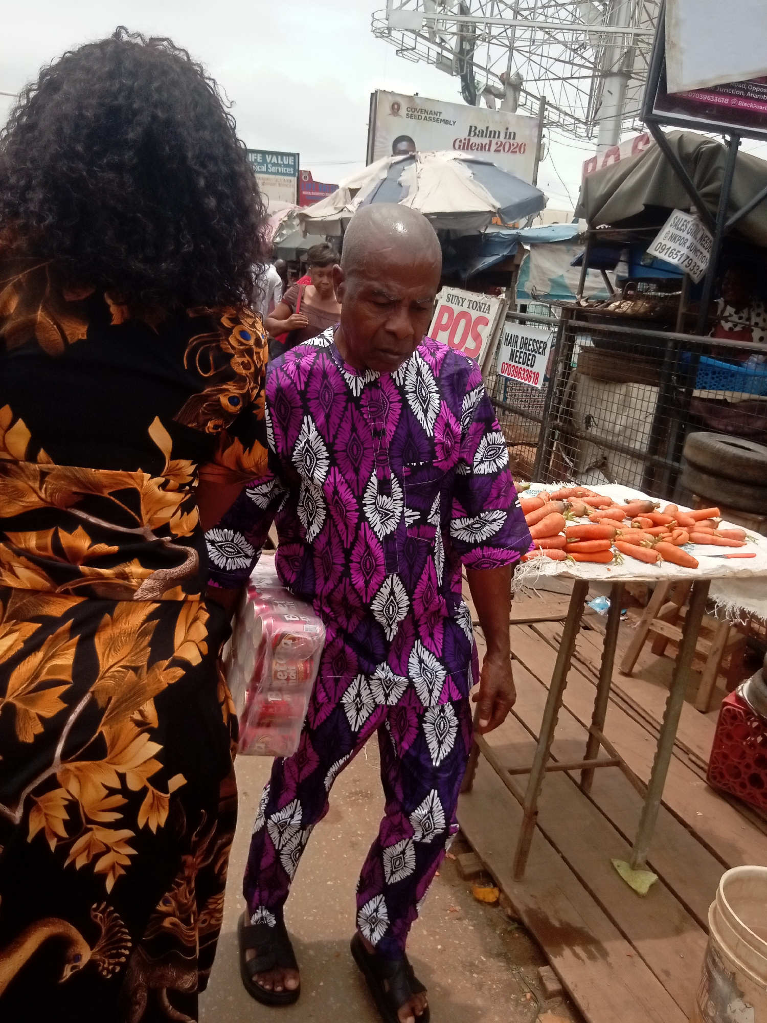An image taken in Nkpor, Nigeria, shows an elderly bald man carrying a pack of bottled drinks. He wears a purple and white patterned two-piece outfit and black sandals. He is walking on a raised woode…read more