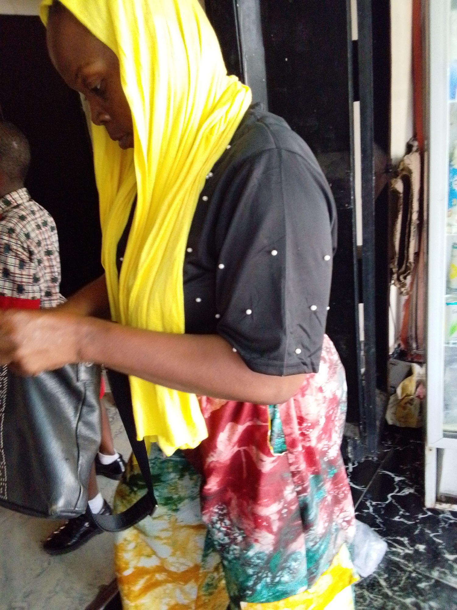 A woman with dark skin and short hair is wearing a bright yellow headscarf, a black blouse with small white embellishments, and a colorful red, green, yellow, and white patterned skirt. She is standin…read more