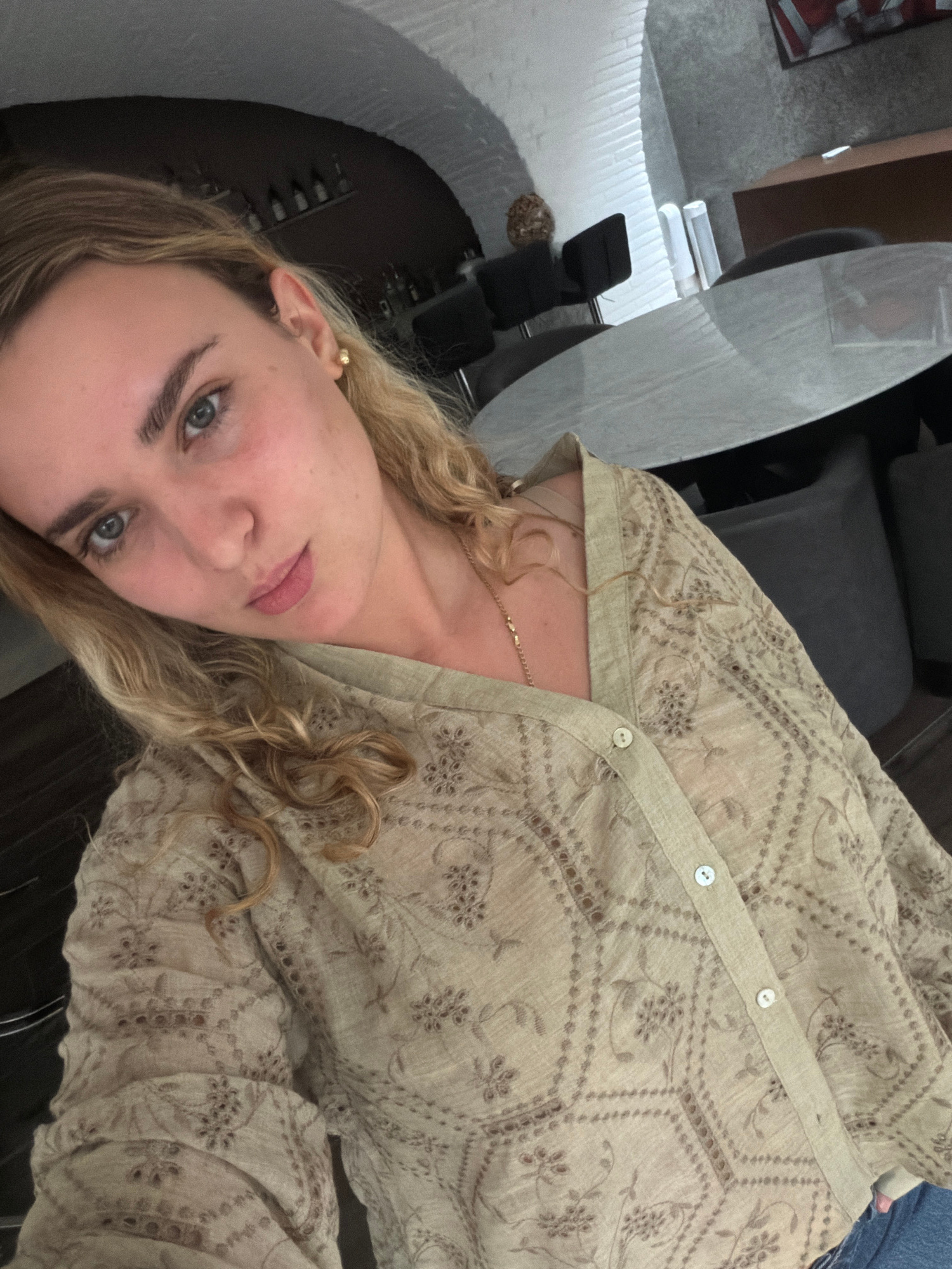 A woman with blonde curly hair, wearing a patterned beige button-down shirt, is the primary subject of the image. She is looking directly at the camera with blue eyes. A gold chain necklace is visible…read more