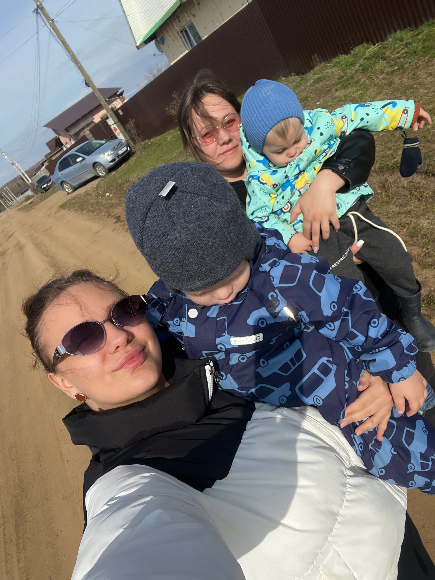The image shows a woman lying down outdoors with two young children. The woman is wearing sunglasses and a black and white jacket. One child, wearing a blue hat and a blue and green patterned jacket,…read more