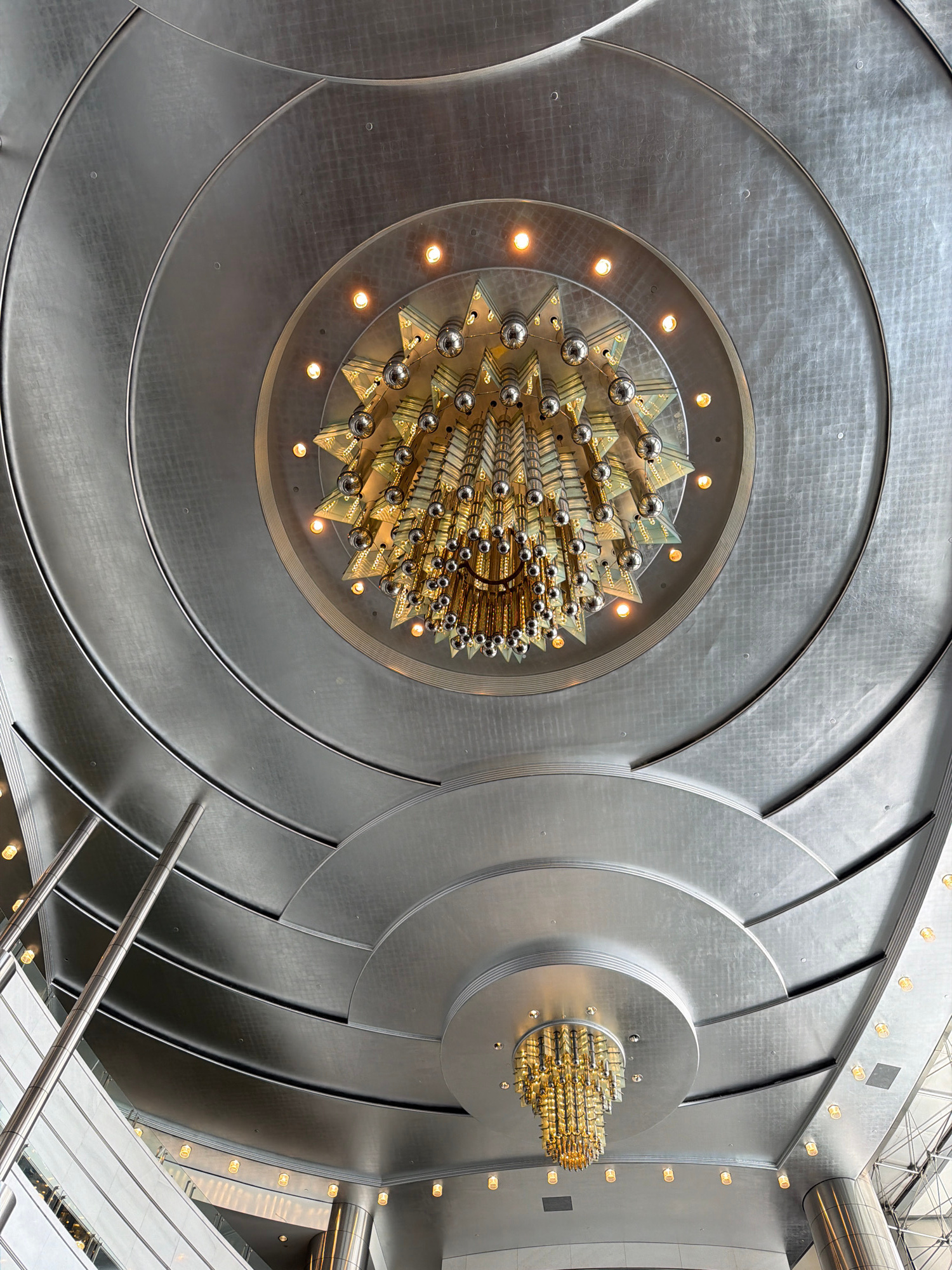 The image showcases a complex ceiling design in Kuala Lumpur, Malaysia. It features a silver metallic surface with concentric circular patterns, interrupted by angular, wedge-shaped elements that crea…read more