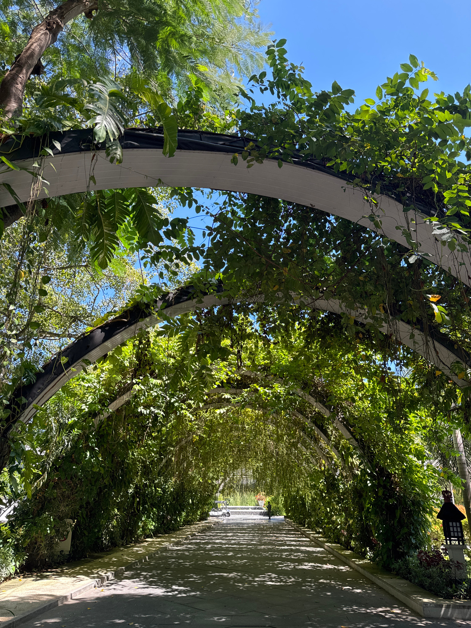 The image shows a covered walkway or pergola in Kuta Selatan, Indonesia. The structure is composed of white arches, heavily overgrown with green foliage, creating a tunnel-like effect. Sunlight filter…read more